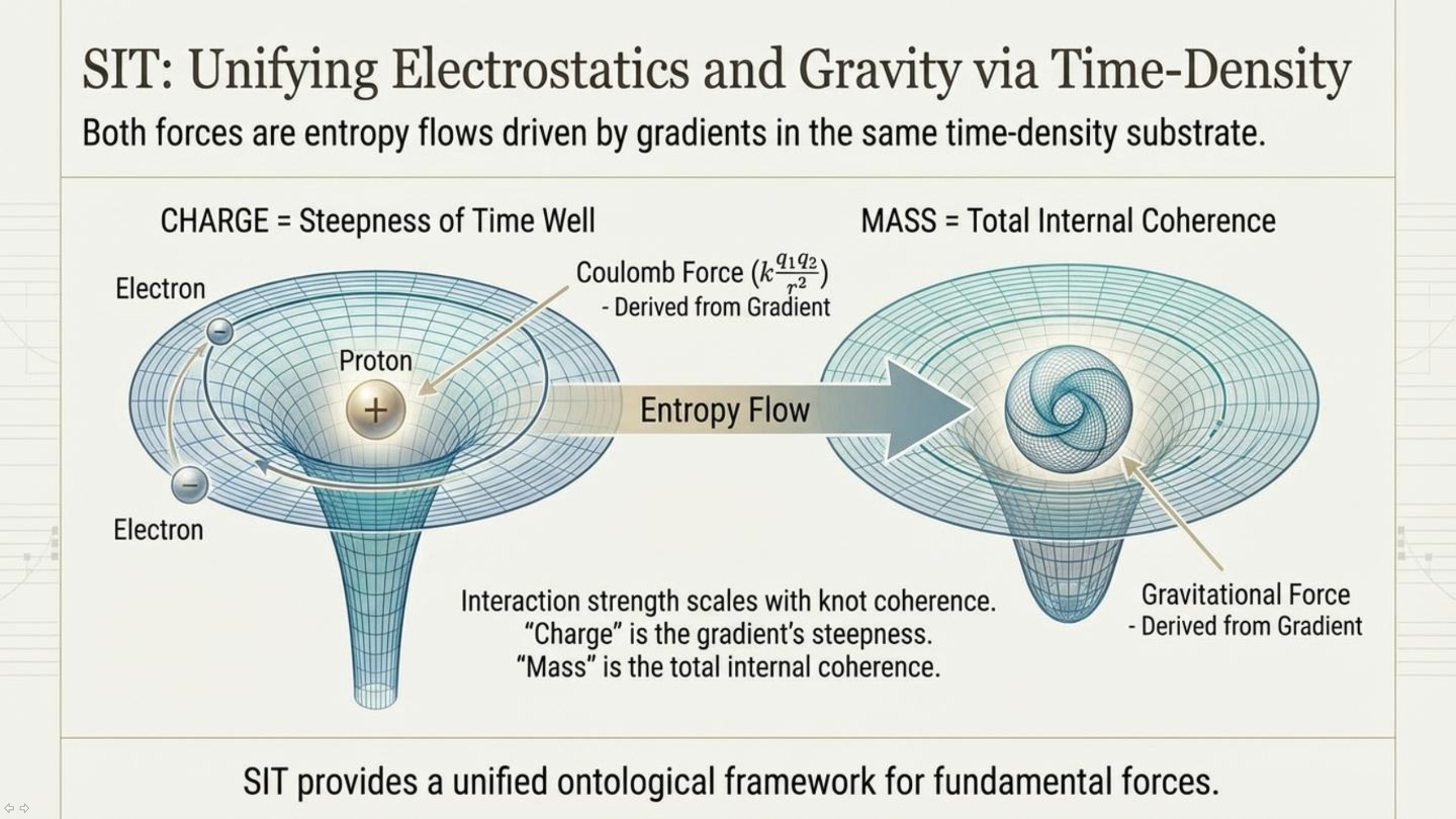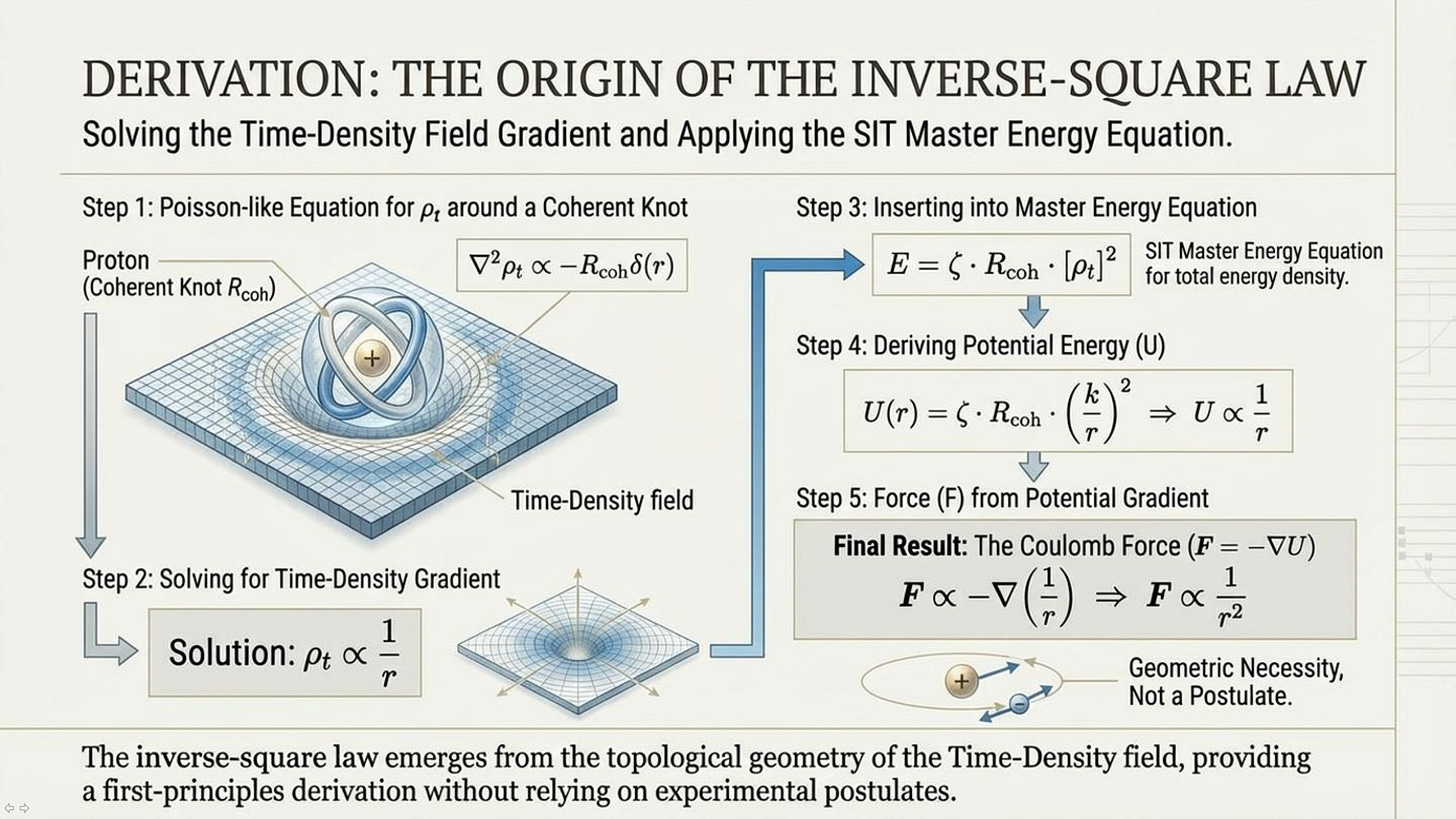 We didn’t input the Inverse-Square Law. We derived it. This implies that what we call “Electrostatics” is actually an entropic force caused by the geometry of time density.