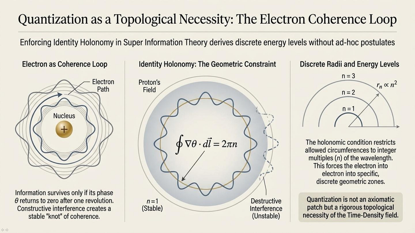 We proved that the condition for this—Identity Holonomy (∮ ∇θ ⋅ dl = 2πn)—forces the electron to exist only at specific, discrete radii.