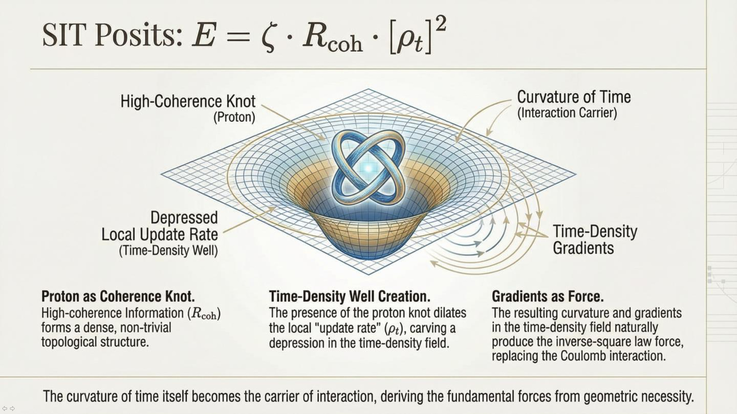 In our new derivation, we don’t assume charge exists. Instead, we model the proton as a “knot” of high coherence that distorts the local flow of time. It creates a Time-Density Well—essentially, a zone where the “update rate” of the universe is dilated (slowed down), similar to General Relativity.