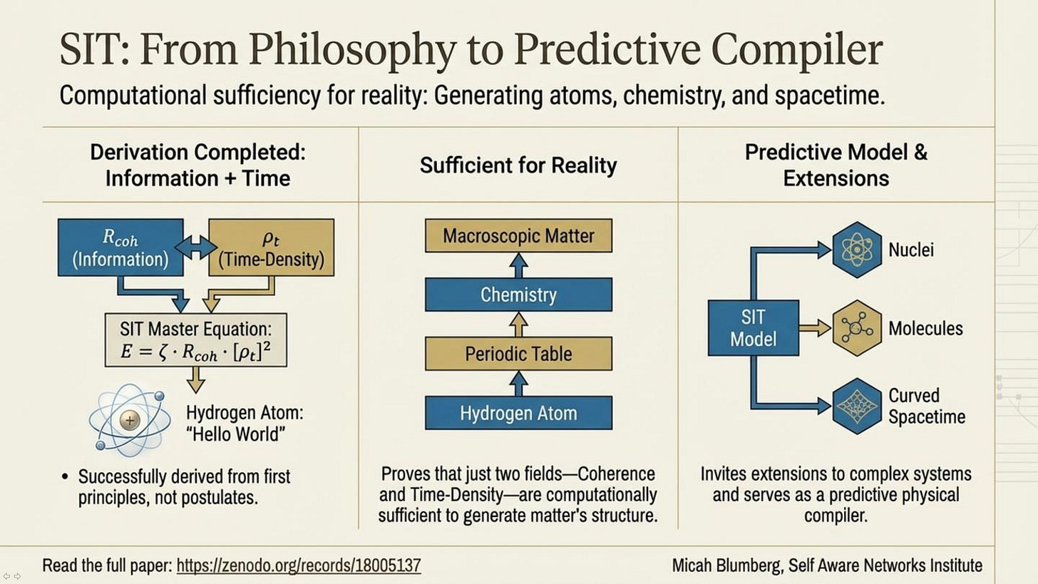 This paper marks the transition of SIT from a theoretical framework to a predictive physical model. We have shown that if you start with just two fields—Coherence and Time-Density—you essentially get the structure of matter for free.
