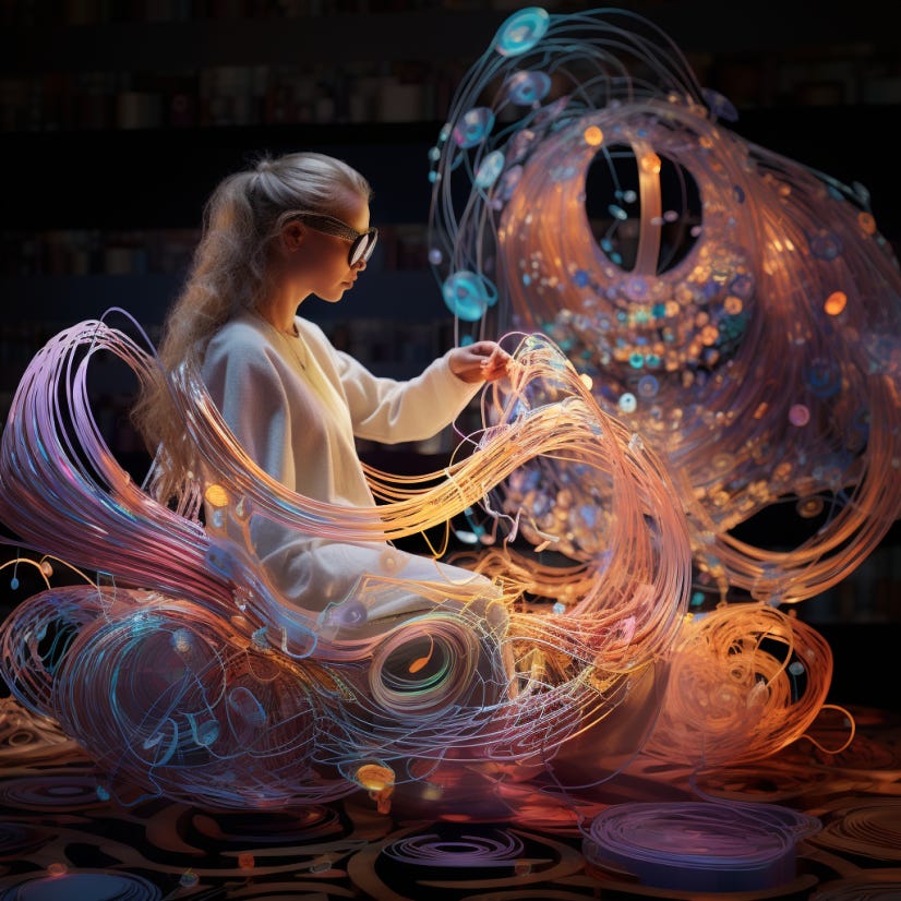 A blend of augmented and mixed reality: digital sticky notes float around a physical room, anchoring to walls, chairs, and windows as reminders and plans. Some notes dissolve into full-blown 3D models of projects, while others display open source code or multimedia projects. The colors transition between warm hues of reality and cool digital blues, creating a sense of fusion between the real and the digital, where work and creativity seamlessly interlace.The AI Seamstress of Creativity