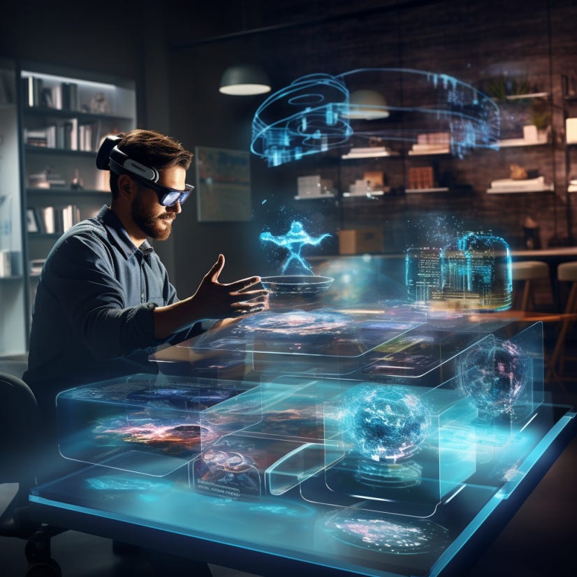 Imagine a towering, futuristic workspace with holographic 3D folders and applications suspended in midair. A user sits at the center, with AI avatars assisting in generating AR and VR experiences in real time. The scene showcases flowing data, digital code spinning in fluid motion around the user’s hands, as their environment shifts from a coding interface to a stunning landscape, built by their command. The art symbolizes how deeply integrated AI can become as an assistant in building and interacting with your digital world.Digital Notes Anchored in Reality