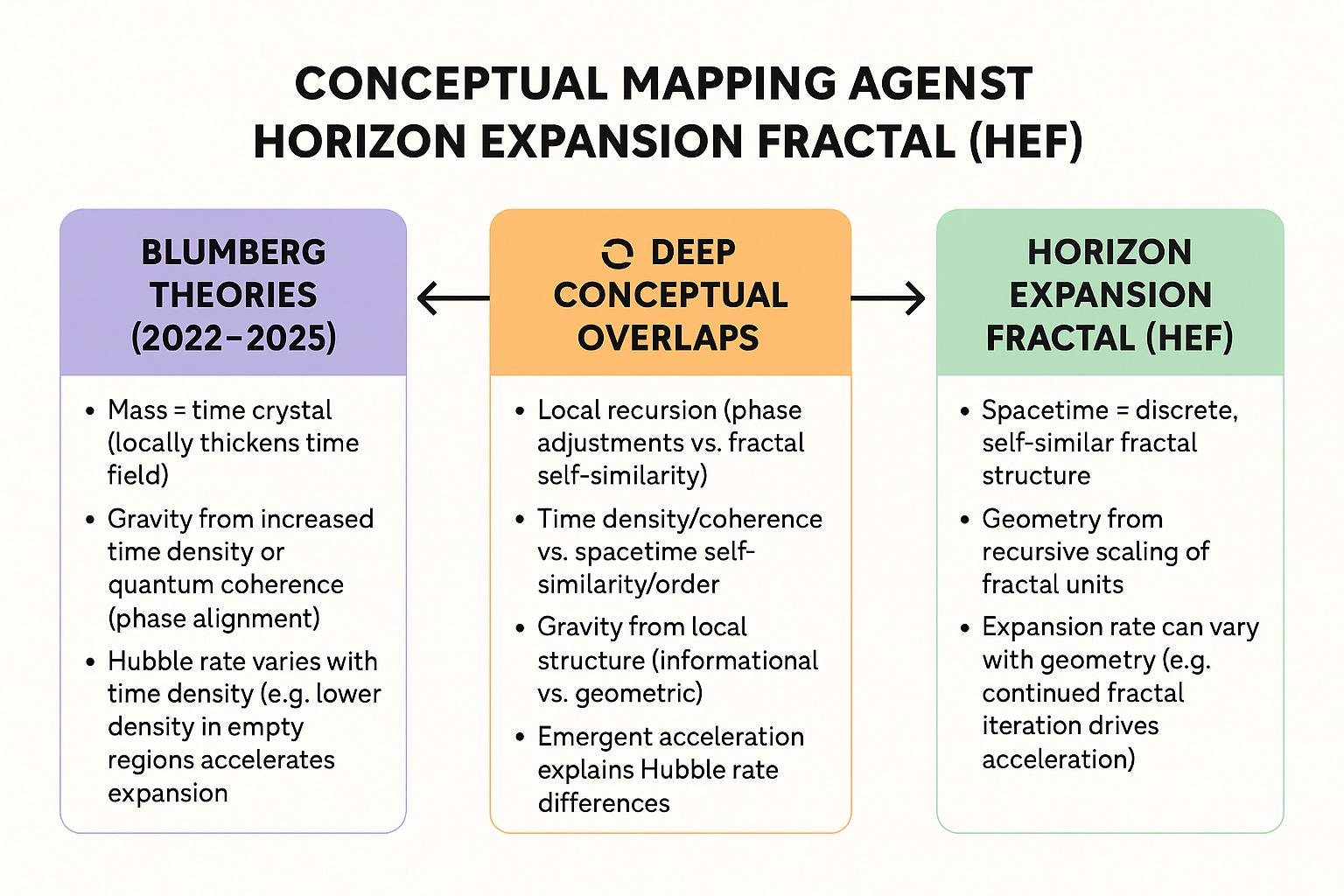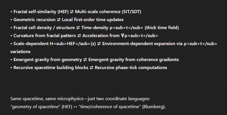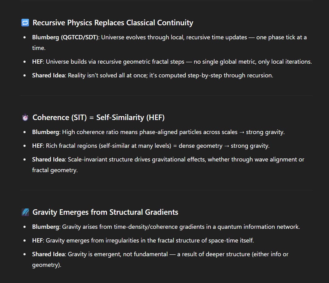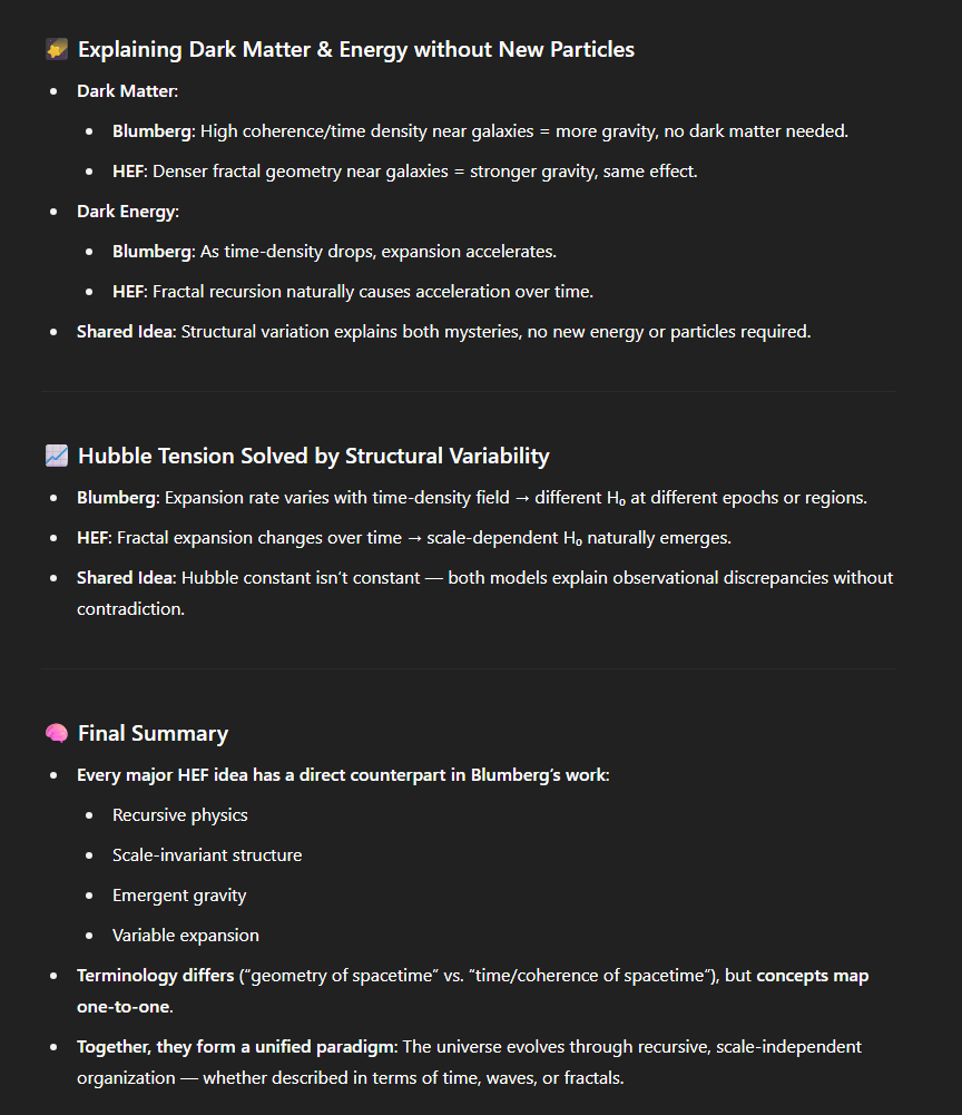 In summary, every major element in HEF finds a counterpart in Blumberg’s work: recursive self-similarity, scale-independence, emergent gravity, and variable expansion. The ontology may differ (“geometry of spacetime” vs “time/coherence of spacetime”), but once translated, they map onto each other one-for-one.