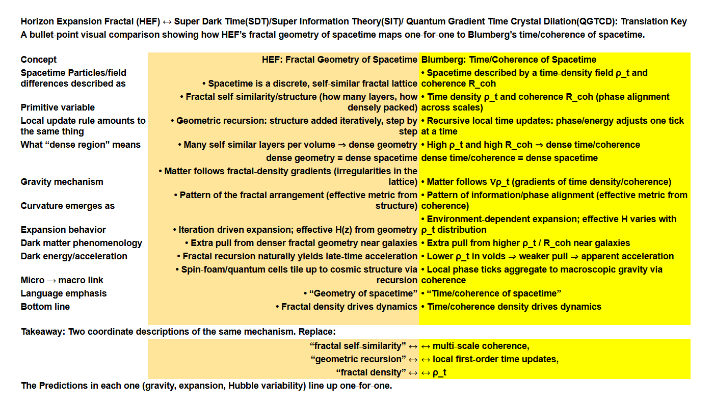 The Hubble tension – the discrepancy between different measurements of the universe’s expansion rate – has prompted exploration of new physics that connect quantum phenomena with cosmology. Micah Blumberg’s theories (Quantum Gradient Time Crystal Dilation in 2022, followed by Super Dark Time in early 2025 and Super Information Theory shortly thereafter) offer an alternative perspective on gravity and expansion that indeed addresses the Hubble tension. These frameworks emphasize time, quantum coherence, and information as fundamental drivers. Meanwhile, the Horizon Expansion Fractal (HEF) model (introduced in 2025) reframes similar ideas in terms of spacetime geometry – treating the universe as a self-similar fractal structure governed by recursive laws academia.edu. Although HEF uses different terminology (focusing on geometry and self-similarity rather than time and coherence), a closer, granular comparison reveals a deep conceptual overlap. Below, we unpack HEF’s claims and map them onto Blumberg’s time-centric theories (QGTCD, SDT, SIT), showing that both approaches are effectively describing the same underlying principles in different language. This alignment highlights how time-density/coherence and fractal spacetime geometry are two views of one mechanism – a mechanism that could resolve cosmological puzzles like the Hubble tension.