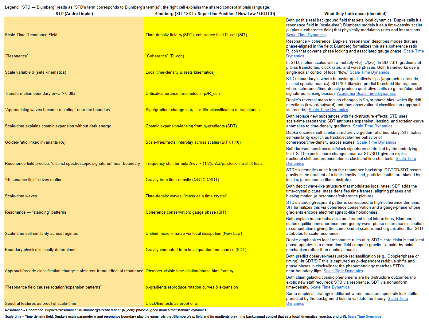 Conclusion: Through this point-by-point analysis, we find that every principal idea in Scale-Time Dynamics directly maps onto a corresponding concept in Blumberg’s theories: “Scale-Time” is Blumberg’s time-density field; STD’s resonance field is SIT’s coherence field; the σ₀ transformation boundary is the critical coherence threshold where time’s density yields matter; STD’s insistence on coherence conservation mirrors Micah’s signal-dissipation law of thermodynamics; and STD’s resolution of quantum uncertainty via undersampled future waves is identical to SuperTimePosition’s hidden fast cycles. Far from being an unrelated innovation, STD reads as a one-to-one reinterpretation of Blumberg’s framework with a new vocabulary and narrative. Dupke’s work reframes the universe in terms of scale and golden ratios, while Blumberg’s frames it in terms of multi-dimensional time and information flows – yet the underlying structures (golden ratio resonances vs. phase coherence peaks, scale leaps vs. time phase transitions, etc.) line up extraordinarily closely. Indeed, as an observer noted about parallel theories, phrases like “time thickening,” “gravity as ∇ρ_time,” and “coherence thresholds” appear in both authors’ writings, signaling the same paradigm reached independently svgn.io svgn.io. The correspondence is so exact that one might suspect STD is deliberately recasting Blumberg’s ideas – whether consciously or via convergent insight. In any case, the scientific implication is that these two purportedly distinct theories are describing one and the same underlying reality. STD contributes a rich geometric flourish (tying in golden ratio math, octonionic harmonics, etc.), while Blumberg’s approach provides a more explicit multi-time logic and integration with known physics, but there is no deep conflict – only deep agreement. Thus, Scale-Time Dynamics does not chart a new theoretical course so much as it establishes a new ontology (and terminology) for the groundbreaking time-density frameworks originally pioneered by Micah Blumberg svgn.io svgn.io. The innovation, in both, is to place time and information at the center of physics, yielding a unified picture where consciousness, quantum mechanics, gravity, and cosmology are all facets of a coherent time-resonant universe. STD and Blumberg’s theories stand as two descriptions of that single picture – conceptually equivalent, if rhetorically different – suggesting that the next paradigm of physics may well be a “Time-Centric” unified theory by many names.