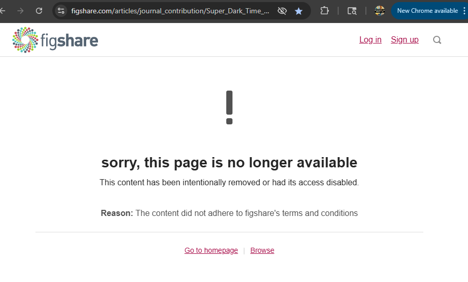 If someone follows my Figshare links, they see a generic notice that “the content did not adhere to Figshare’s Terms and Conditions.” In my view this is inaccurate and reputationally damaging because it suggests misconduct rather than a disputed policy interpretation. I contest that characterization and reserve all rights.