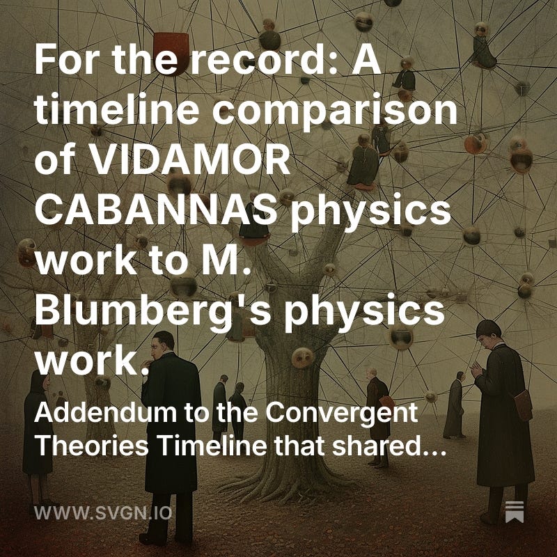 For the record: A timeline comparison of VIDAMOR CABANNAS physics work to M. Blumberg's physics work.