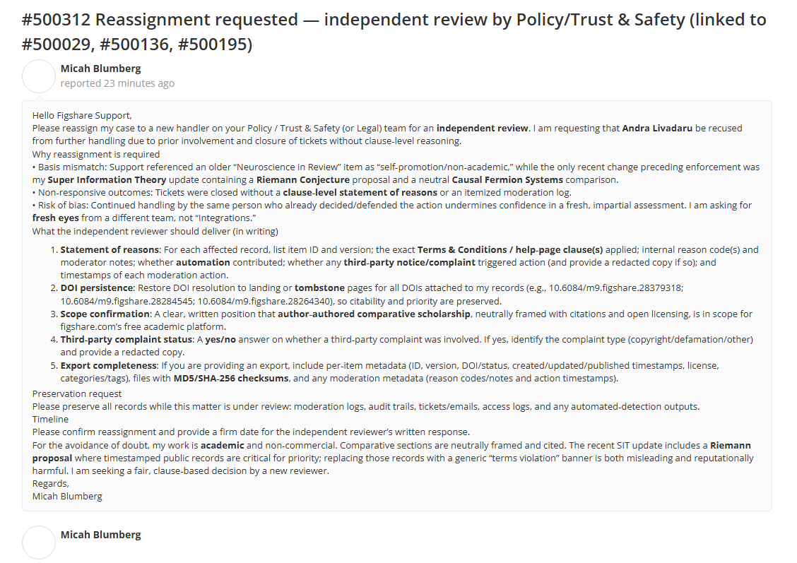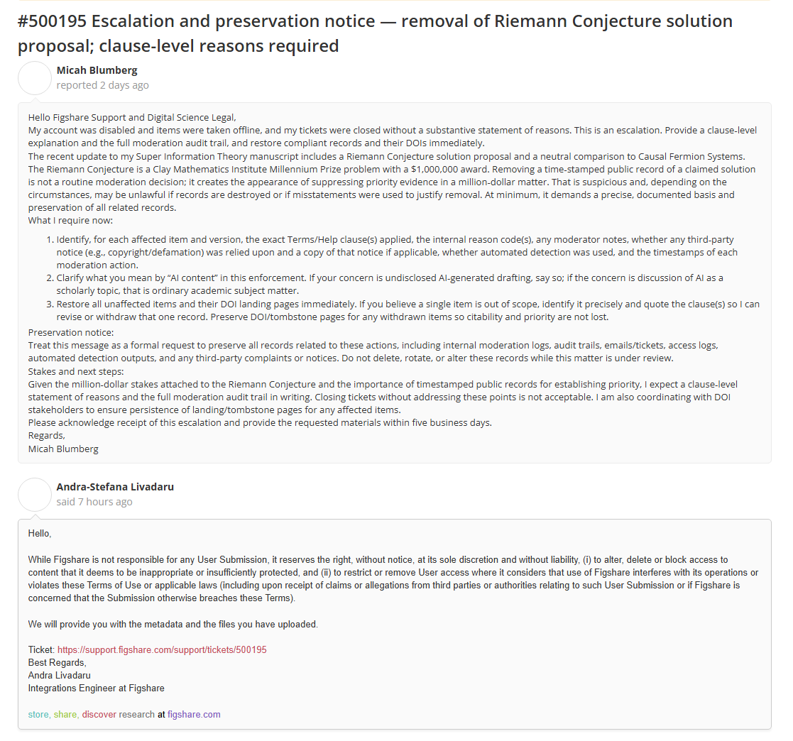I am asking Digital Science and Figshare leadership to intervene, reassign my case to an independent Policy/Trust & Safety reviewer, and restore the integrity of the public record around my recent work. Immediately before my account was disabled, I uploaded a new Super Information Theory (SIT) update that (1) proposes a path toward the Riemann Conjecture and (2) includes a neutral comparison to Causal Fermion Systems (CFS). Support later pointed to an older neuroscience review as “self‑promotion/non‑academic,” and most recently cited Figshare’s “sole discretion” clause permitting removal upon third‑party allegations. My tickets were closed without a clause‑level explanation.