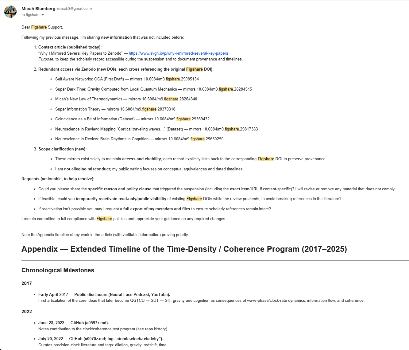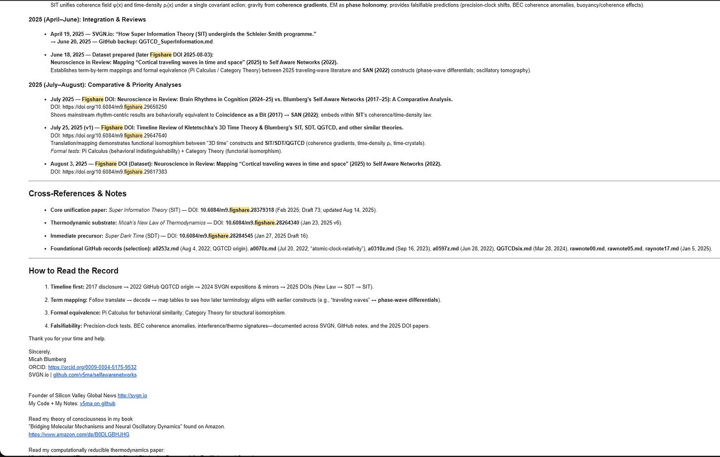 Mark, I’m reaching out because I believe Figshare’s mission—open, citable, long‑lived access to scholarly outputs—aligns exactly with what I’m trying to do. Very recently, my account was disabled and several items were taken offline shortly after I posted a new update to my Super Information Theory manuscript that includes a proposal toward the Riemann C…