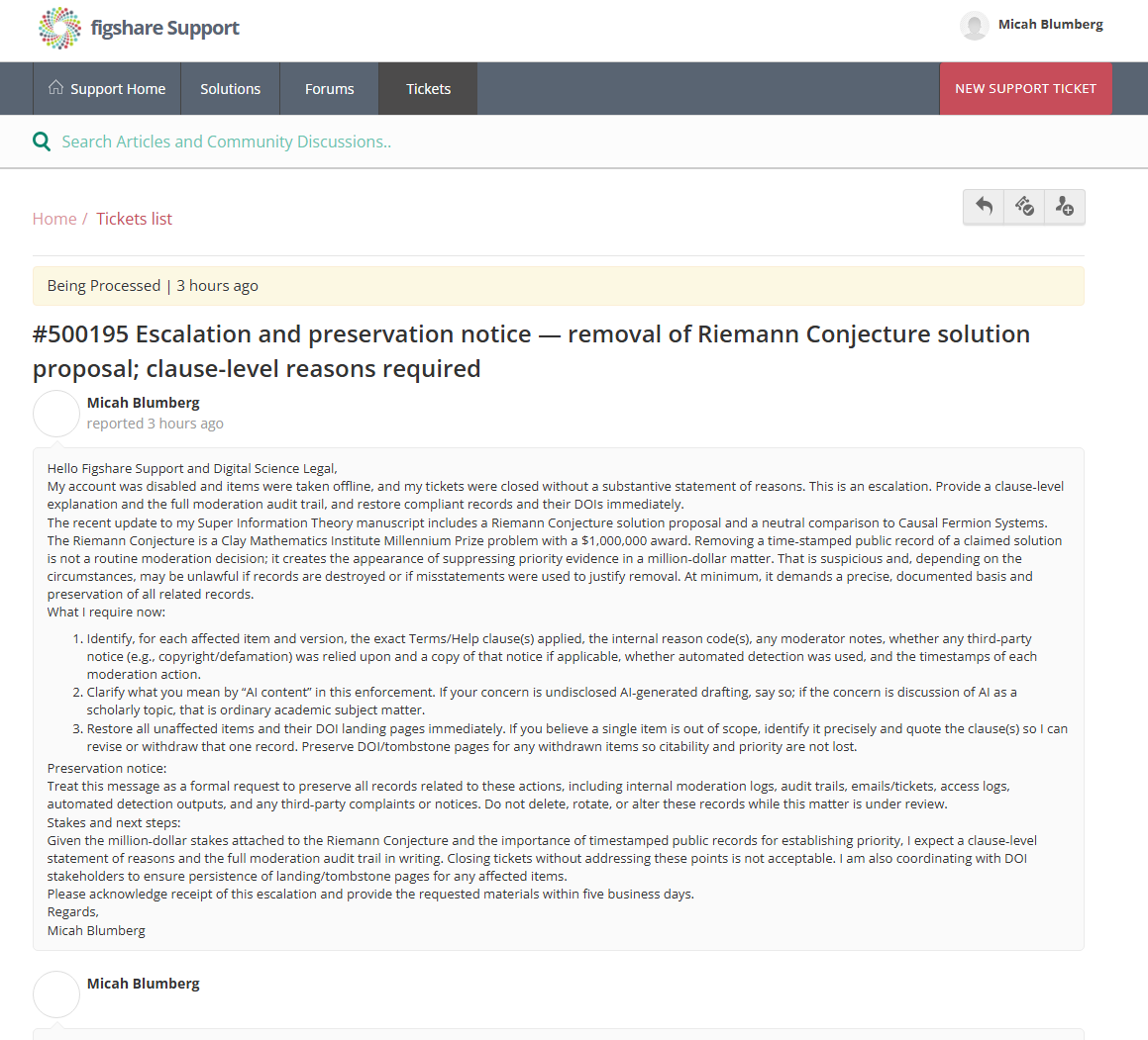 On or about August 21st or 22nd 2025. Figshare shut down my account and removed items shortly after I published a new update to my Super Information Theory manuscript that includes a Riemann Conjecture solution proposal (a $1,000,000 Millennium Prize problem) and a neutral comparison to Causal Fermion Systems. They then pointed to an older “Neuroscience in Review” item and labeled it “self‑promotion/non‑academic,” which misstates the basis of the action and ignores that all of my materials are scholarly. I have asked for clause‑level reasons, the moderation audit trail, preservation of DOI/landing pages, and immediate restoration of compliant items. Below is my escalation letter in full.