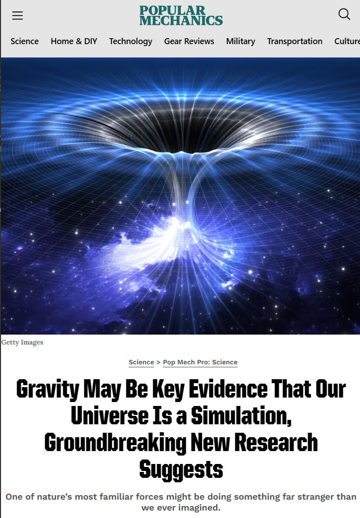 The Popular Mechanics article “Gravity May Be Key Evidence That Our Universe Is a Simulation, Groundbreaking New Research Suggests” presented the idea that gravity may function as an information-processing or optimization mechanism, with behavior that resembles computation rather than a traditional fundamental force. It further suggested that this informational framing could point toward a simulation-like structure of the universe, positioning gravity as part of an underlying computational substrate.