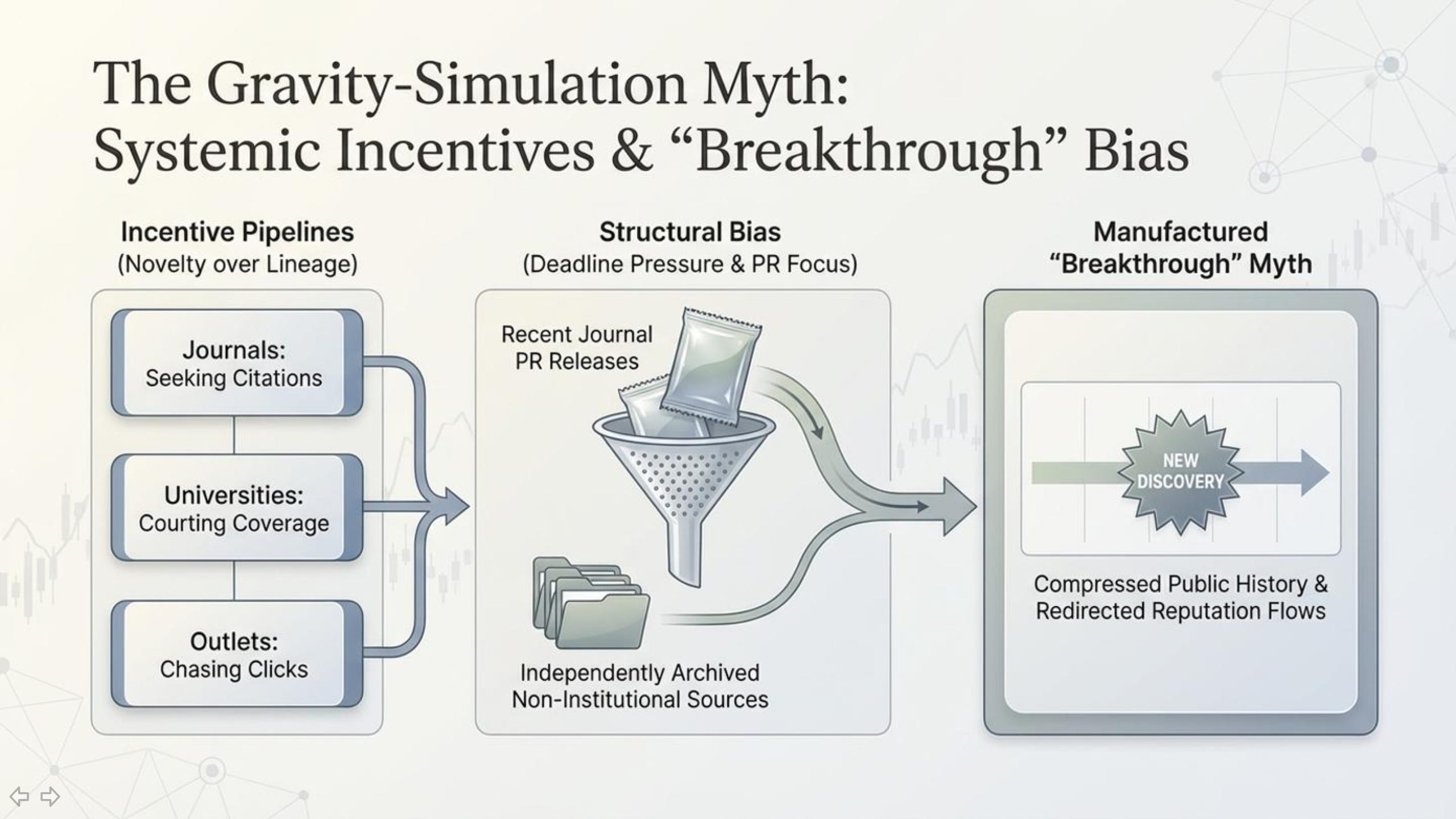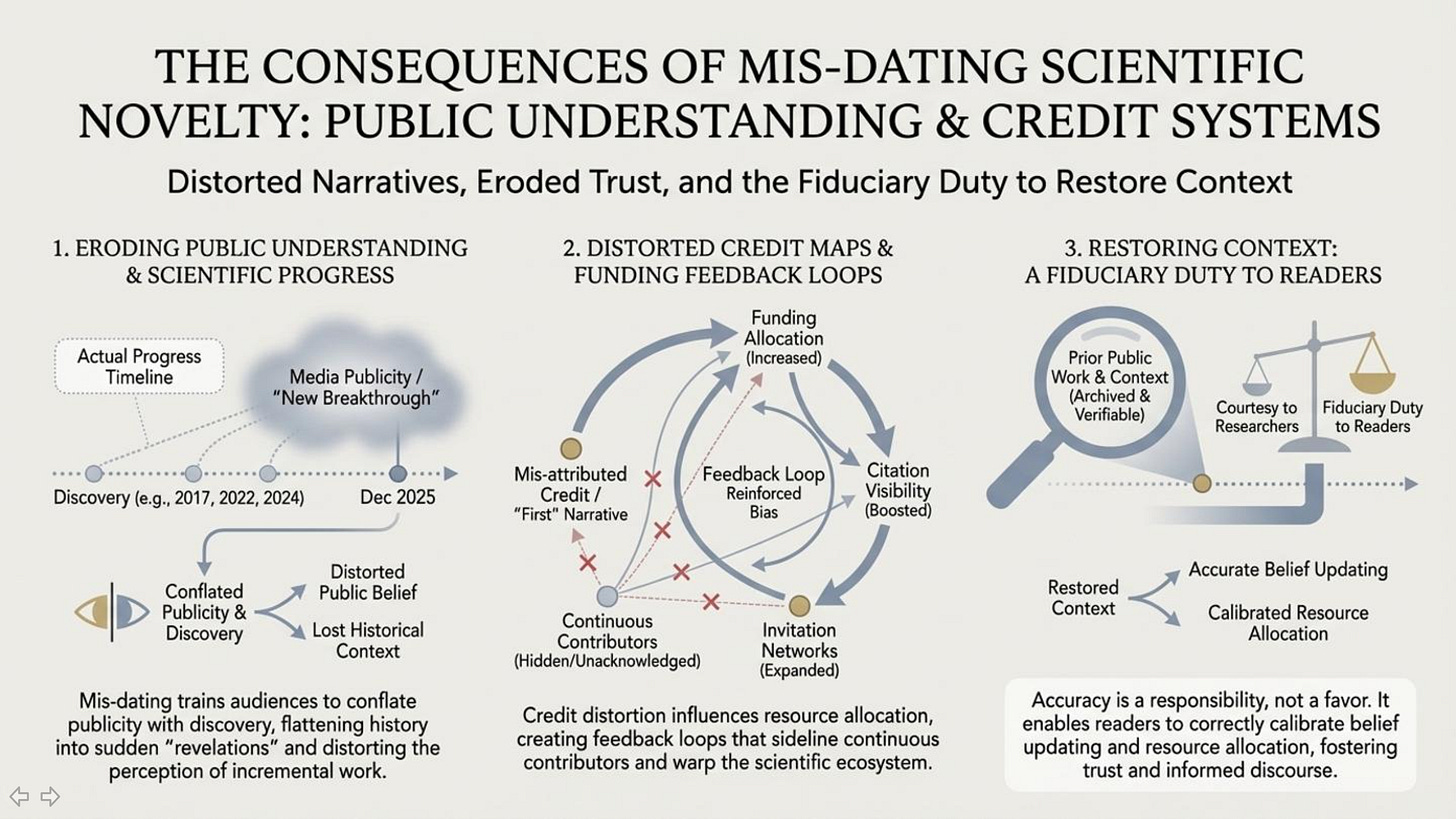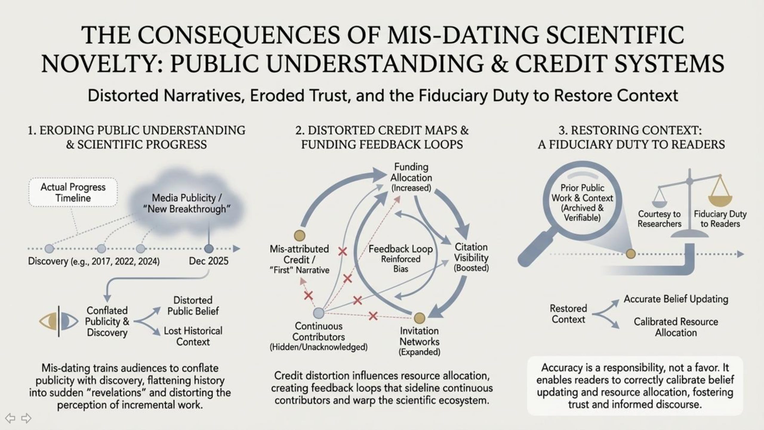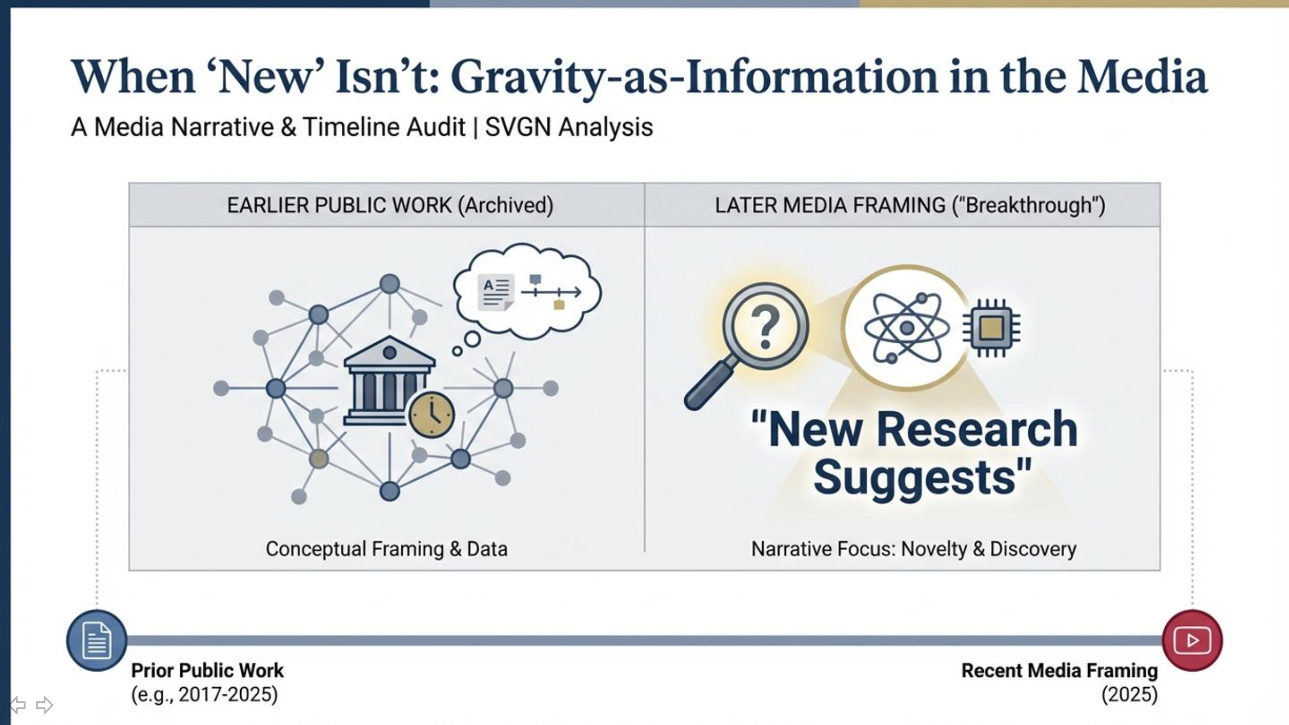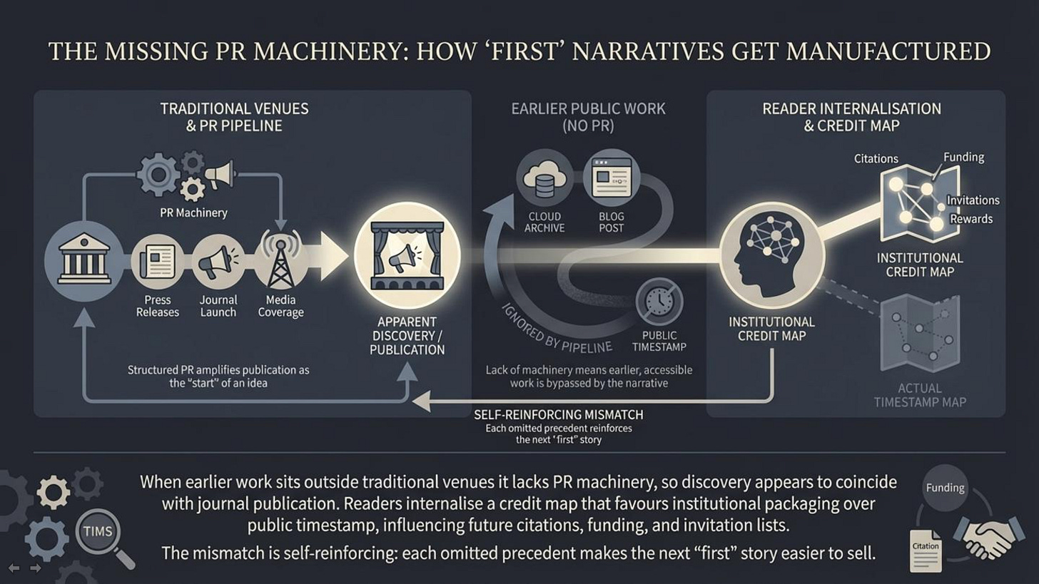 That dynamic becomes especially distorting when earlier work exists outside traditional venues—such as independent archives, long-running public research blogs, preprint ecosystems, or serial publications that don’t sit neatly inside a single journal database. Even if the earlier work is publicly available and clearly timestamped, it can be overlooked simply because it wasn’t funneled through the same PR-and-journal discovery pipeline. Readers are then left with a story that feels authoritative while missing key context.