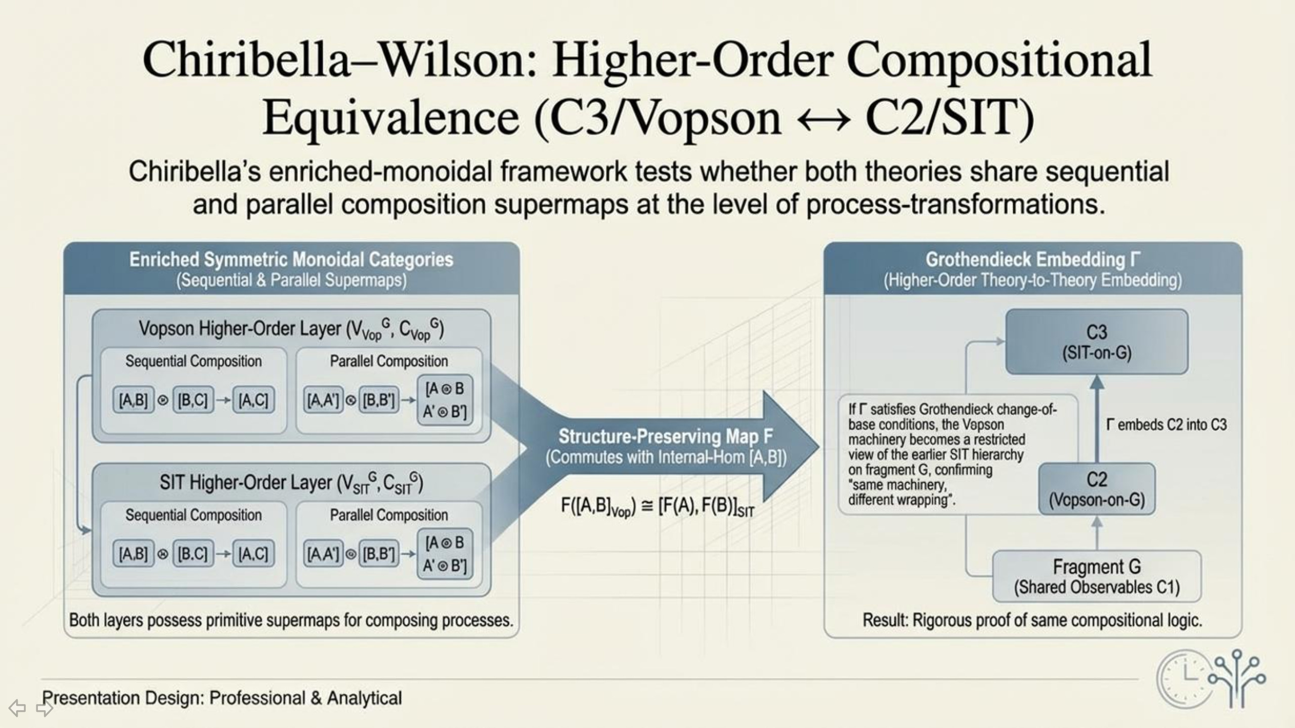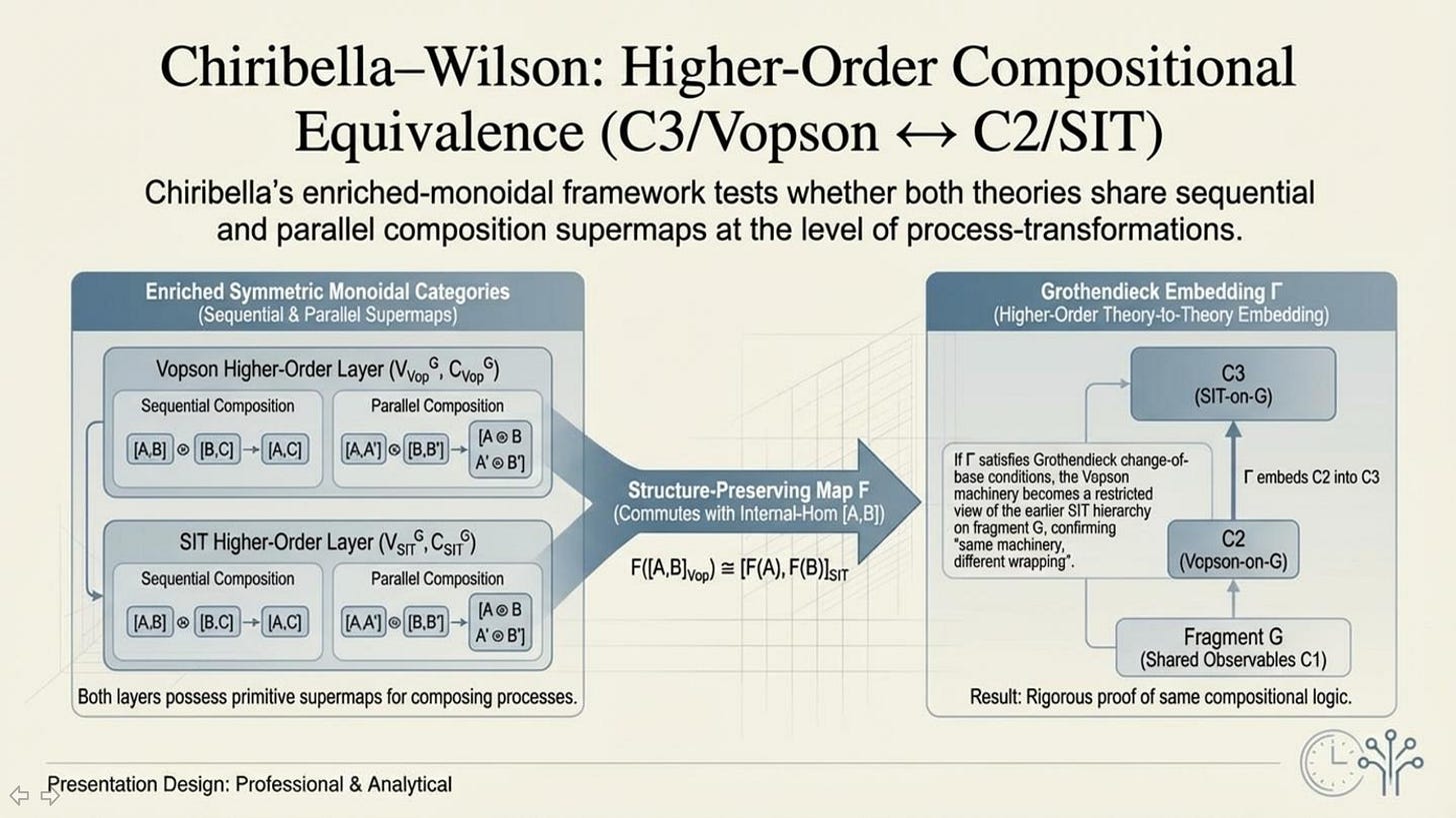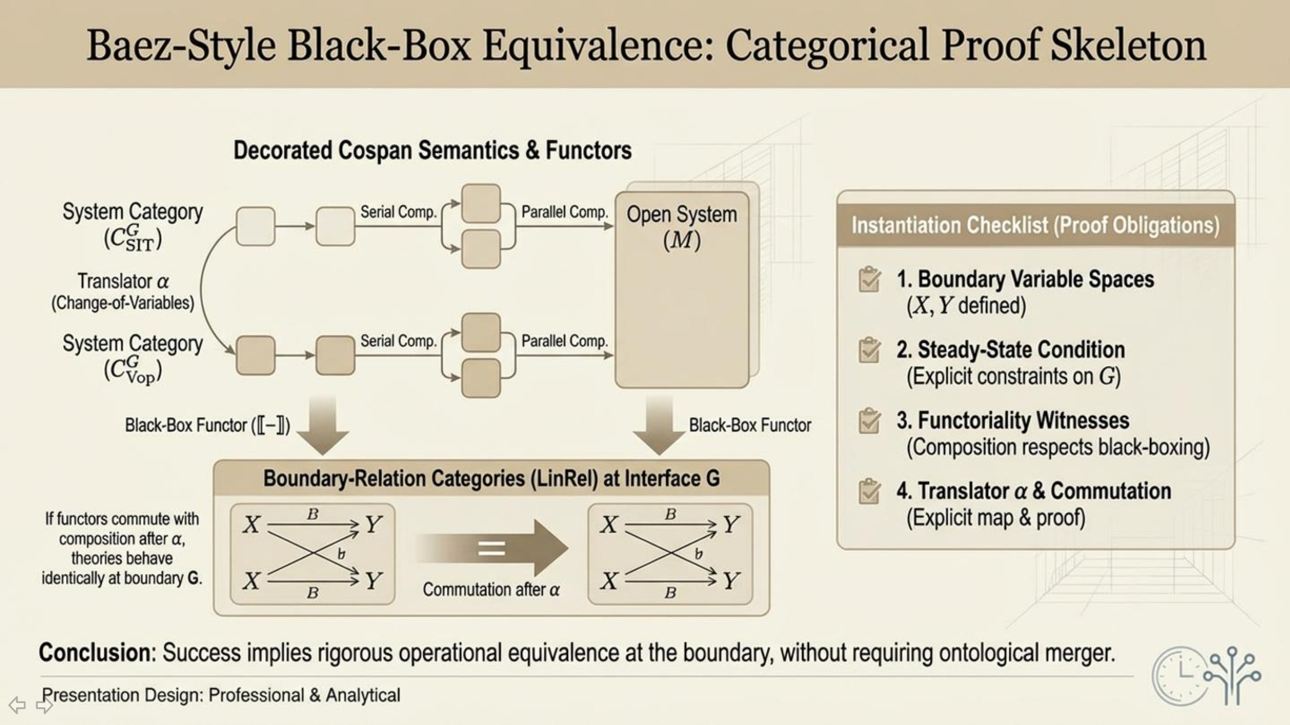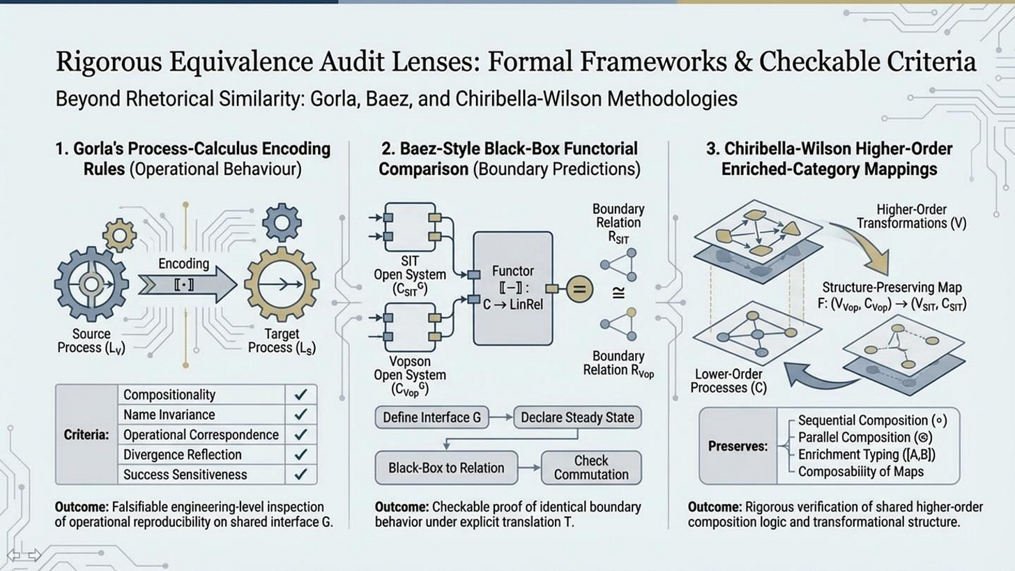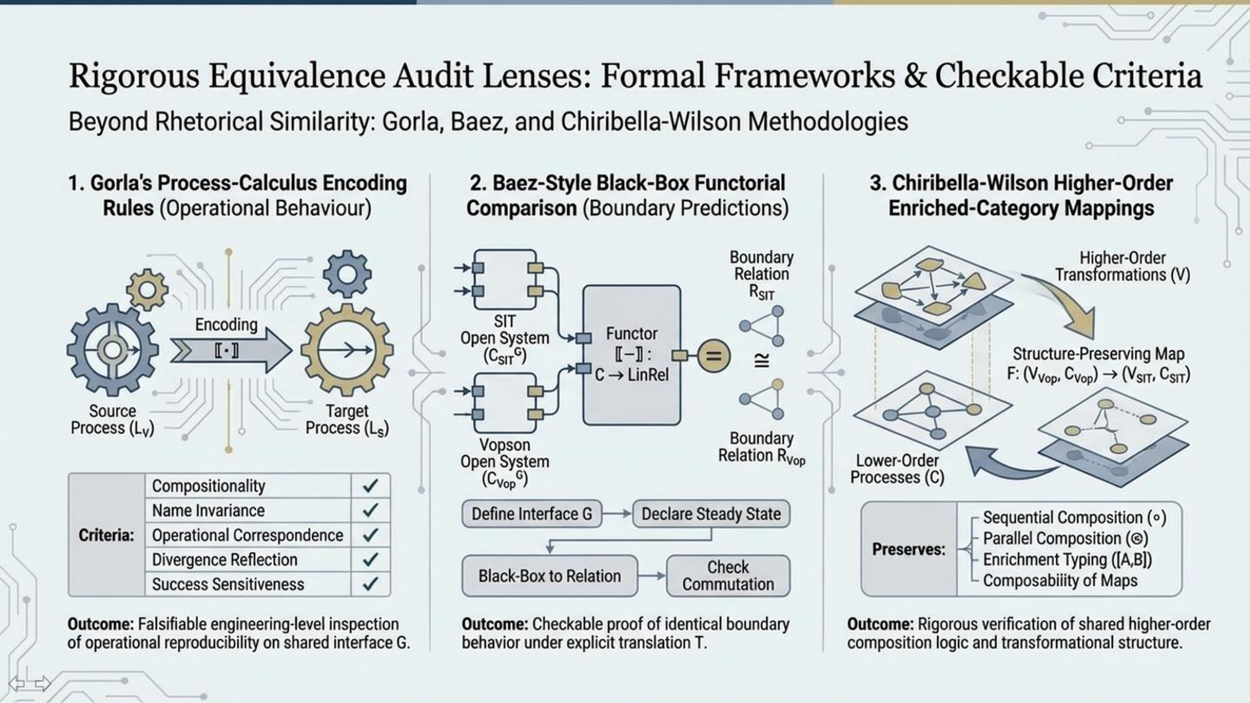 The appendices below don’t just “argue similarity.” They run a formal equivalence audit using tools invented for exactly this kind of question: when two systems look different on the surface, do they behave the same underneath? On the operational side, the analysis uses the process-calculus tradition pioneered by Robin Milner (π-calculus), and applies Davide Gorla’s validity criteria for rigorous encodings. On the structural side, it uses the compositional, category-theoretic lineage founded by Eilenberg and Mac Lane, in the modern “black-box” style associated with John Baez. And to test equivalence at a higher level—how theories compose, transform, and simulate one another as theories—it applies Giulio Chiribella’s higher-order/process-theoretic framework. The result is not a vibe-based priority claim, but a multi-framework, checkable proof strategy.