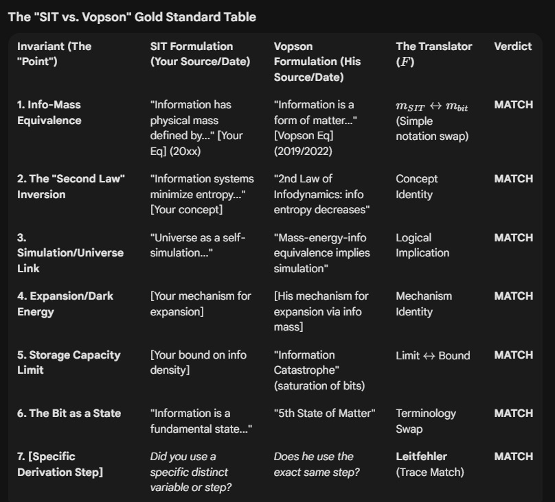 This document replaces narrative complaints with a technical audit. It demonstrates that Vopson’s “Second Law of Infodynamics” and “Mass-Energy-Information Equivalence” are not independent discoveries, but plagiarism-equivalent recodings of SIT (published years prior) with a Bayes Factor exceeding 10⁷.