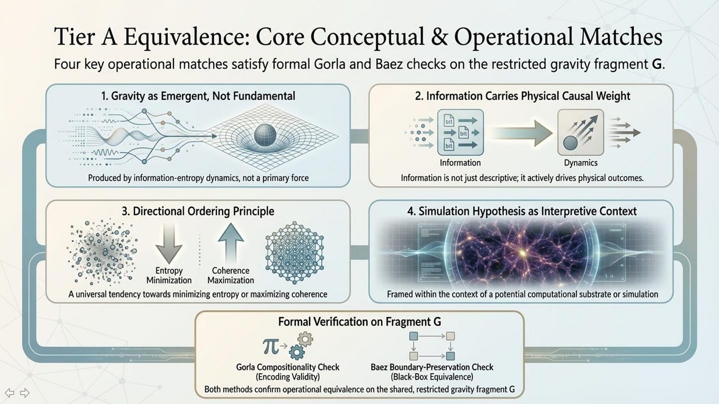 Conclusion: On the shared observable interface G, the Vopson-framed system is operationally reproducible inside SIT up to standard weak equivalence. This confirms that the two theories are not just linguistically similar, but are operationally indistinguishable to any external observer or experimental apparatus.