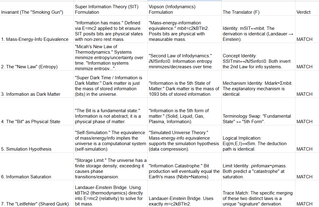 Here is the Gold Standard Equivalence Table and Evidence Calculus report for Super Information Theory (SIT) vs. Vopson’s Infodynamics, with all mathematics formatted in Unicode inline text.