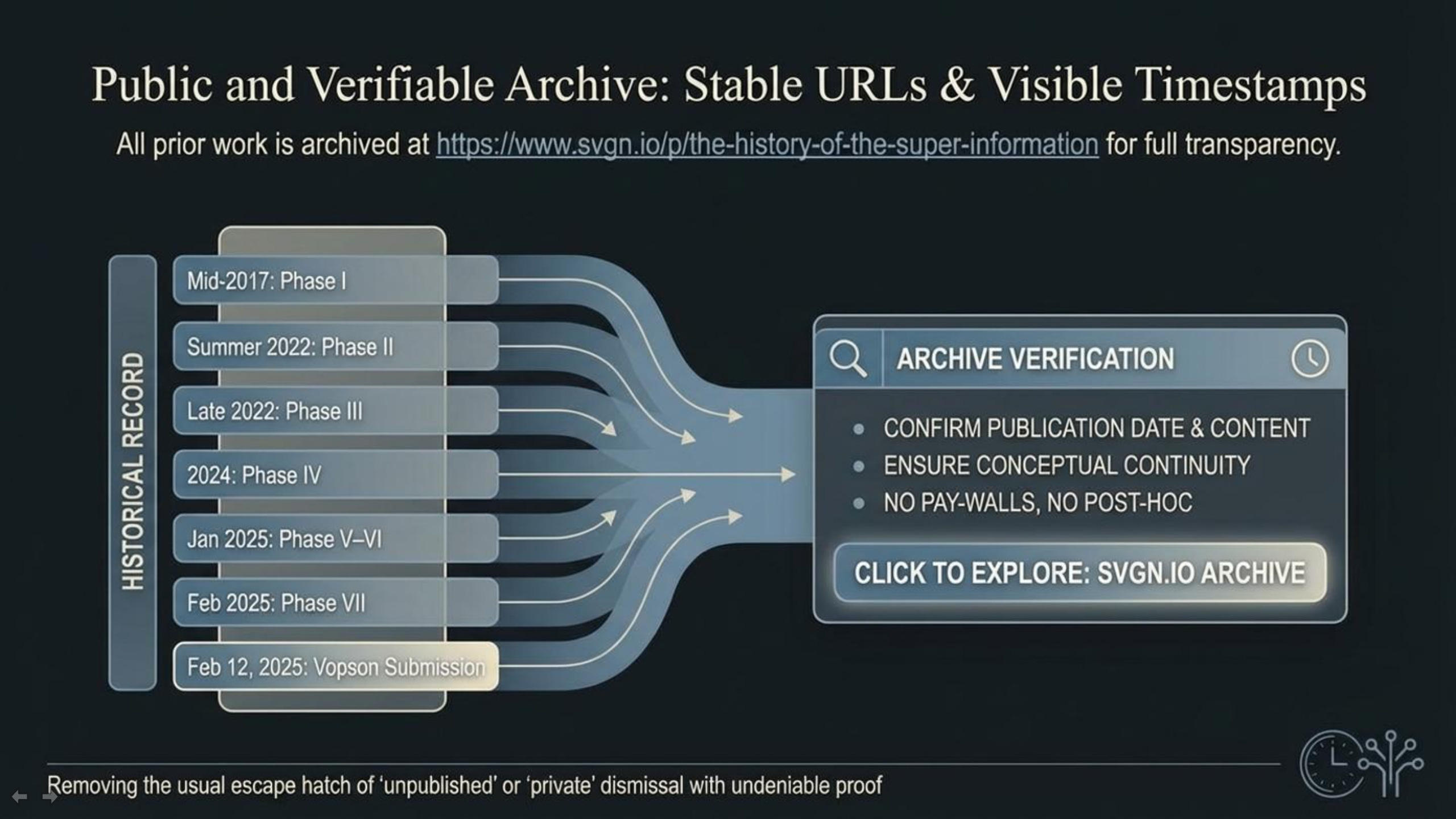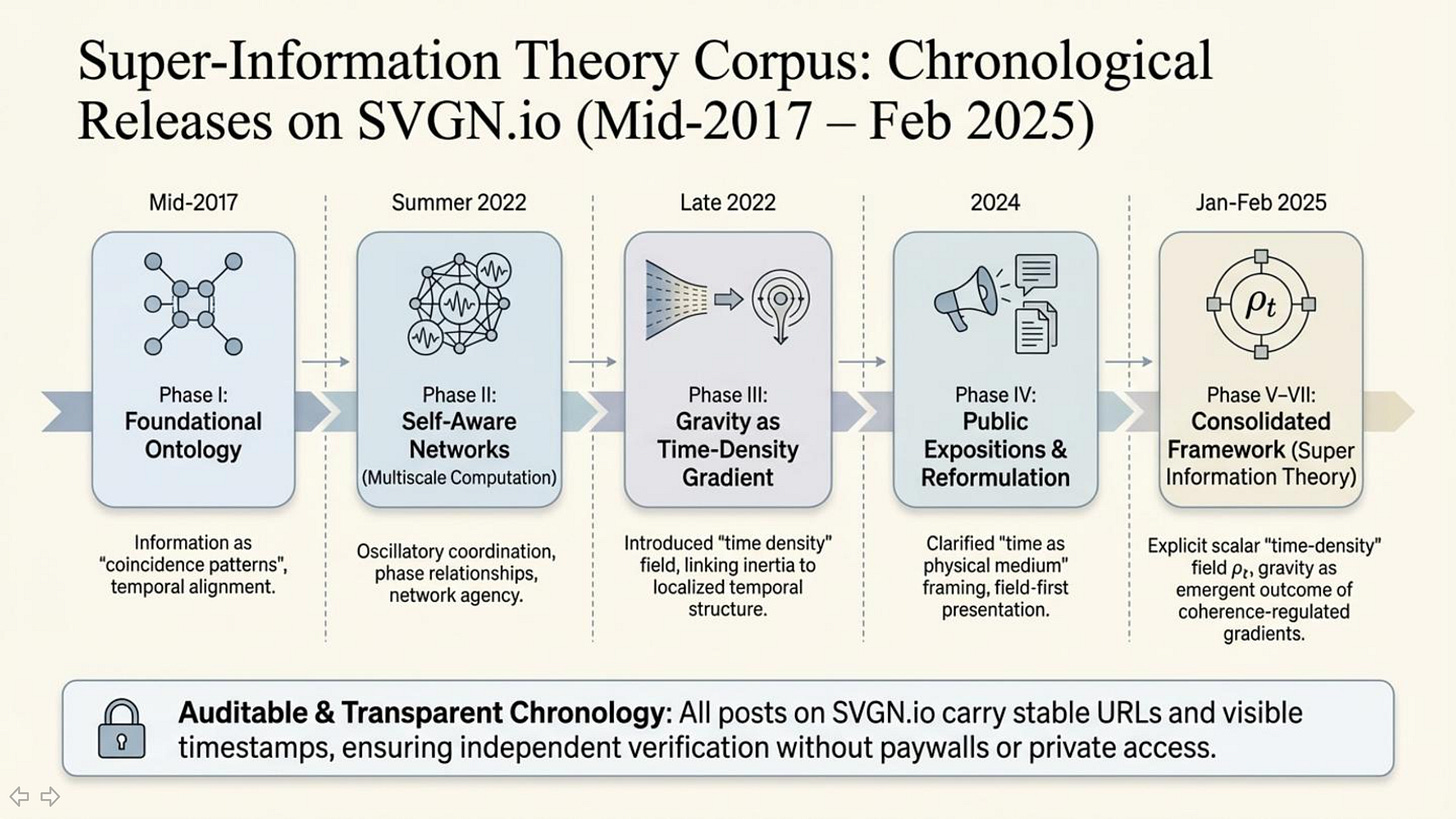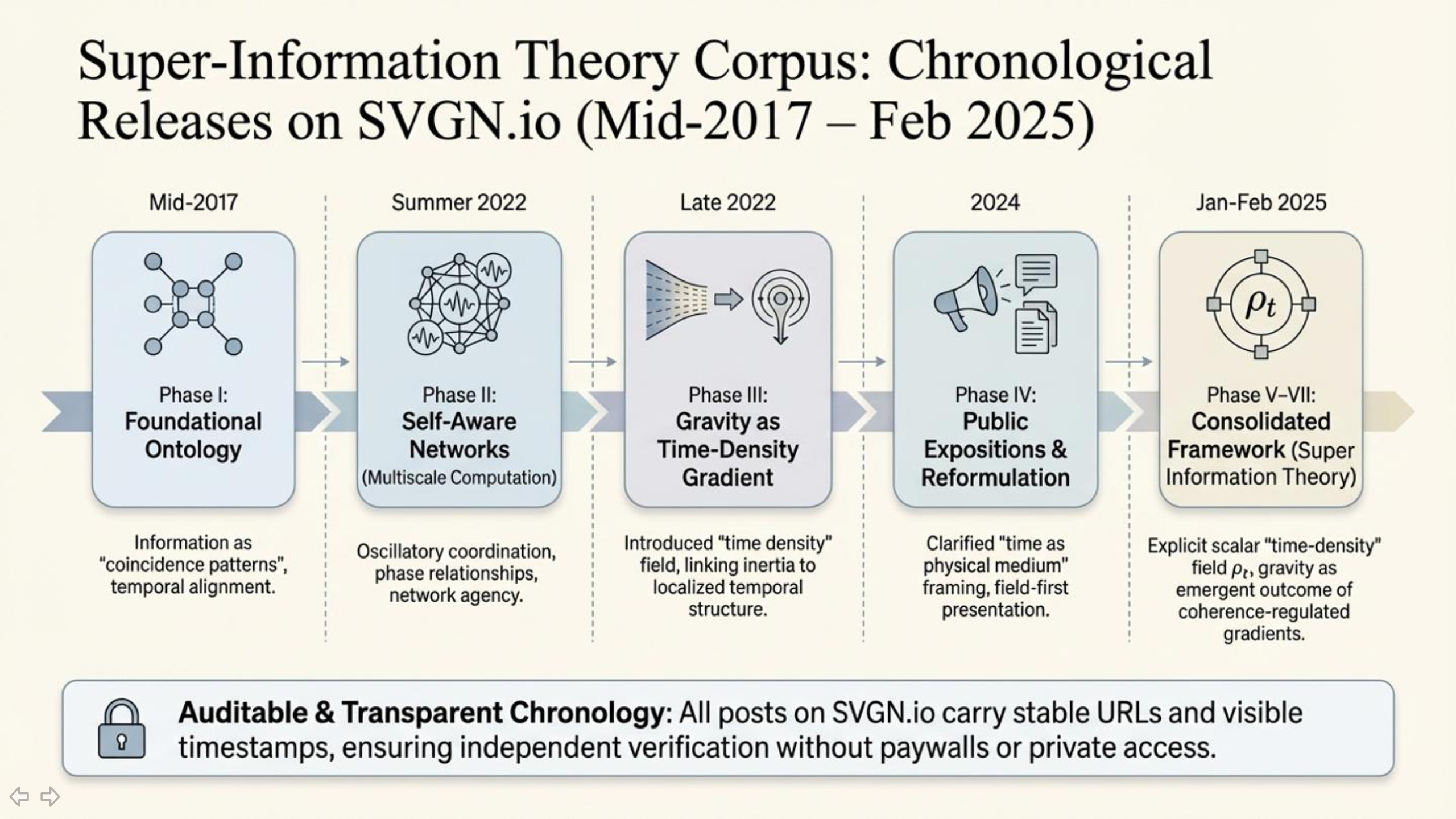 Right above this section, I linked a consolidated historical index that serves as a single verification hub: https://www.svgn.io/p/the-history-of-the-super-information. That page is structured specifically to document the development of the Super Information Theory corpus from its early foundations (2017 onward) through later expansions, and it includes direct links to the relevant public posts and releases along with timestamps. In other words, it is a navigable record of what was published, when it was published, and how the ideas evolved across time.
