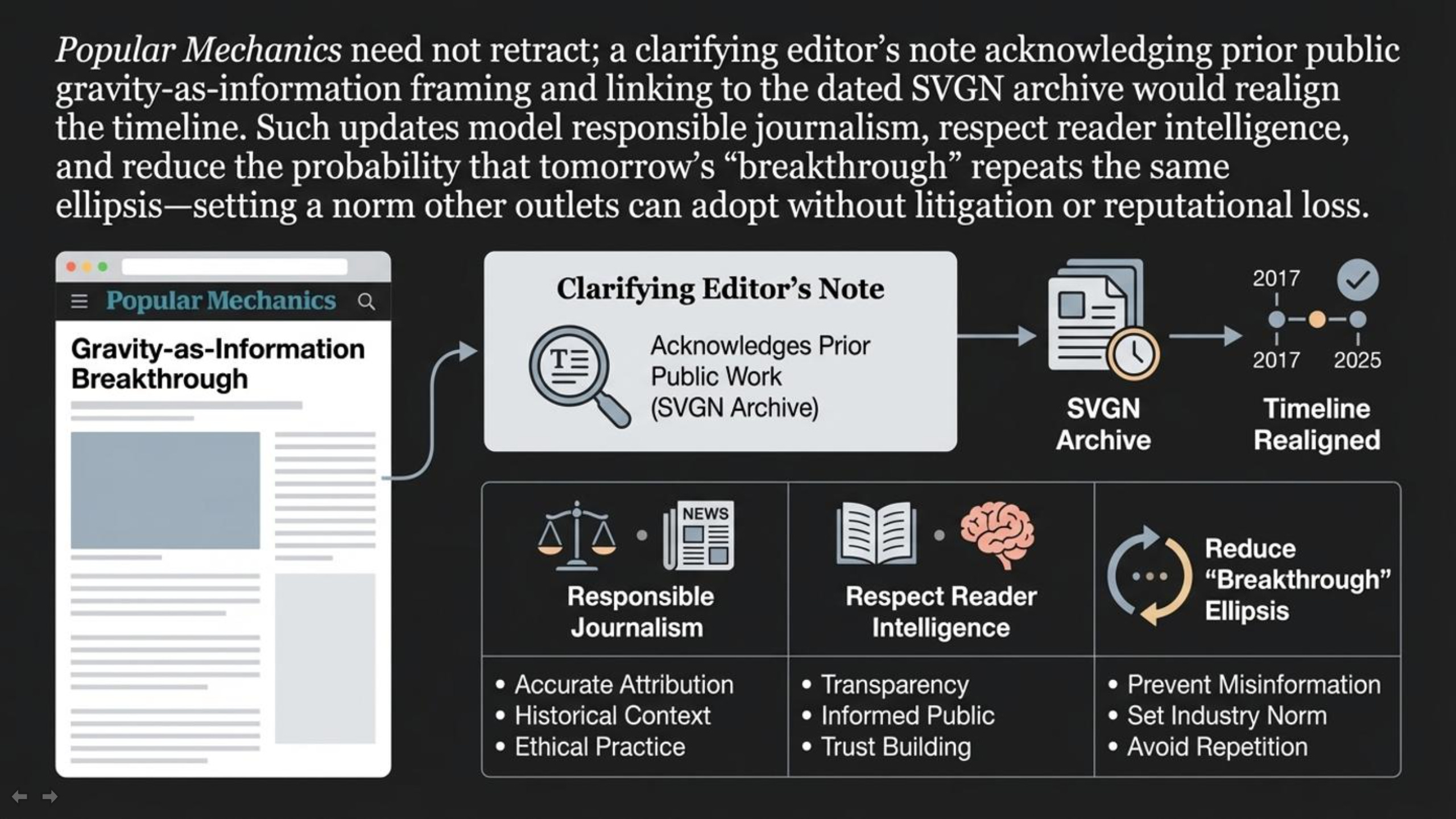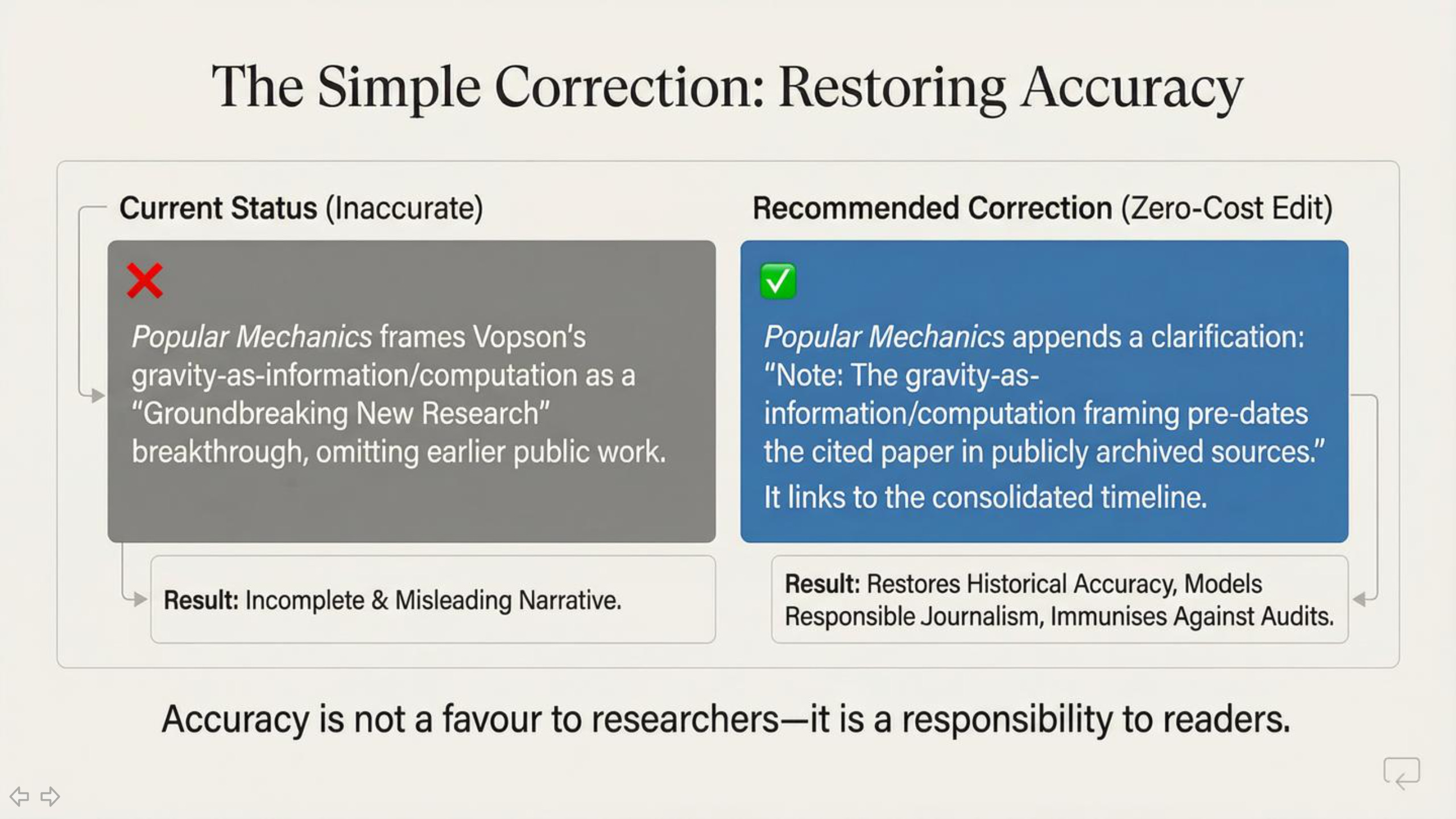 A simple, professional fix would be for Popular Mechanics to add a clarification acknowledging that the gravity-as-information/computation framing predates the cited paper in the public record, and to link to that prior work so readers can see the broader timeline for themselves. This is not about endorsing any particular framework. It is about accurately describing the state of the idea: not “newly discovered,” but newly packaged and newly promoted.