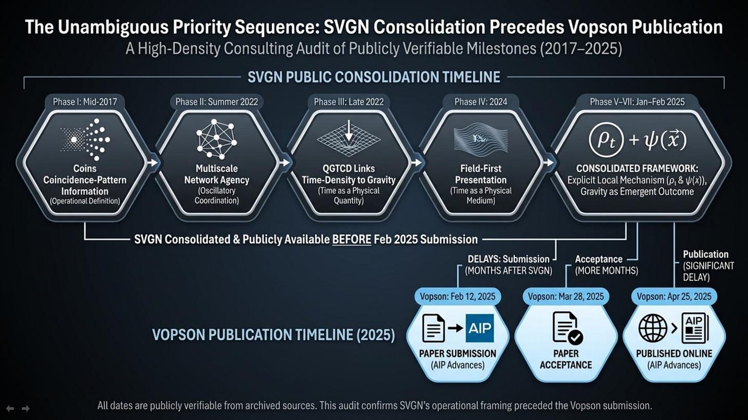 ψ(x)and time-density fieldρt(x)), with gravity described as emerging from coherence-regulated time-density gradients. SVGNFeb 12, 2025: Vopson’s paper (“Is gravity evidence of a computational universe?”) is submitted to AIP Advances. SVGN