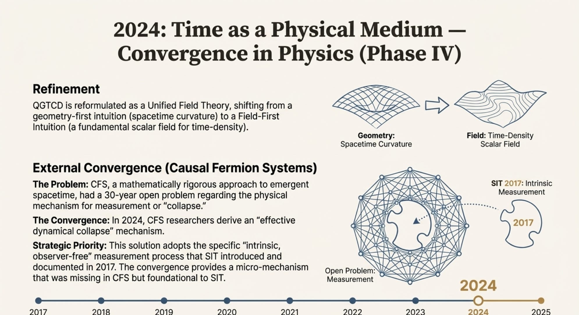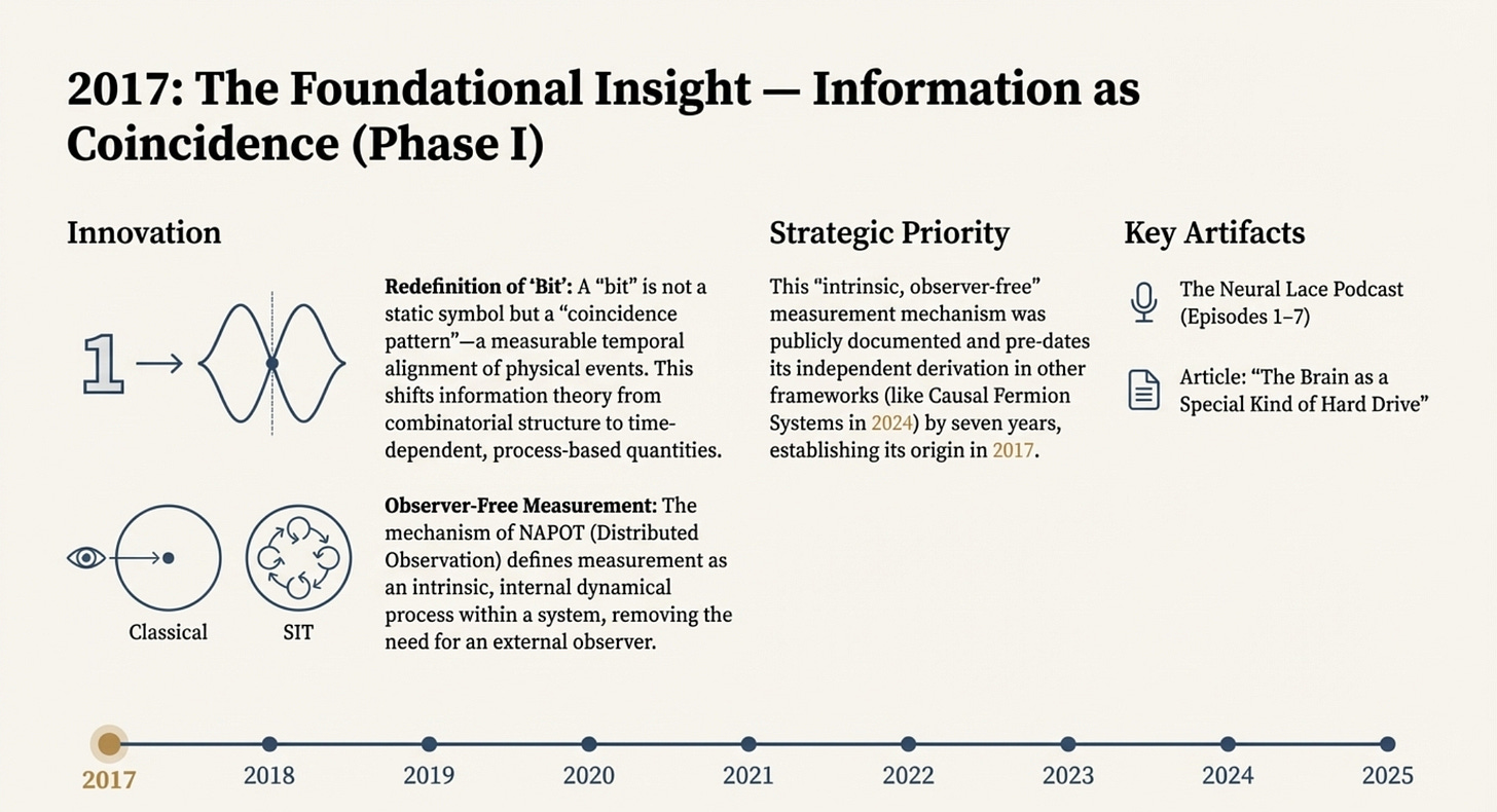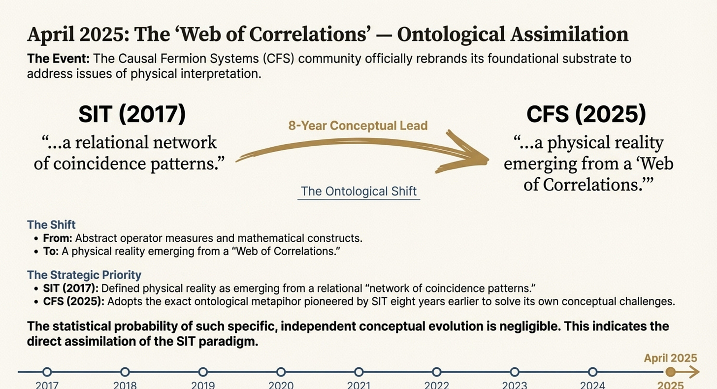 1. The “Web of Correlations” (2025) In 2017, I publicly defined the fundamental substrate of physical reality not as a pre-existing spacetime, but as a relational network of “coincidence patterns”. This informational ontology was a distinct departure from standard geometric approaches. In April 2025—eight years later—the CFS community explicitly rebranded its substrate description from abstract operator measures to a “web of correlations” within a many-body quantum system. This specific metaphorical framing is not a generic scientific term; it is a conceptual mirror of the SIT “coincidence pattern” network, adopted to provide a physical interpretation for CFS’s abstract math.
