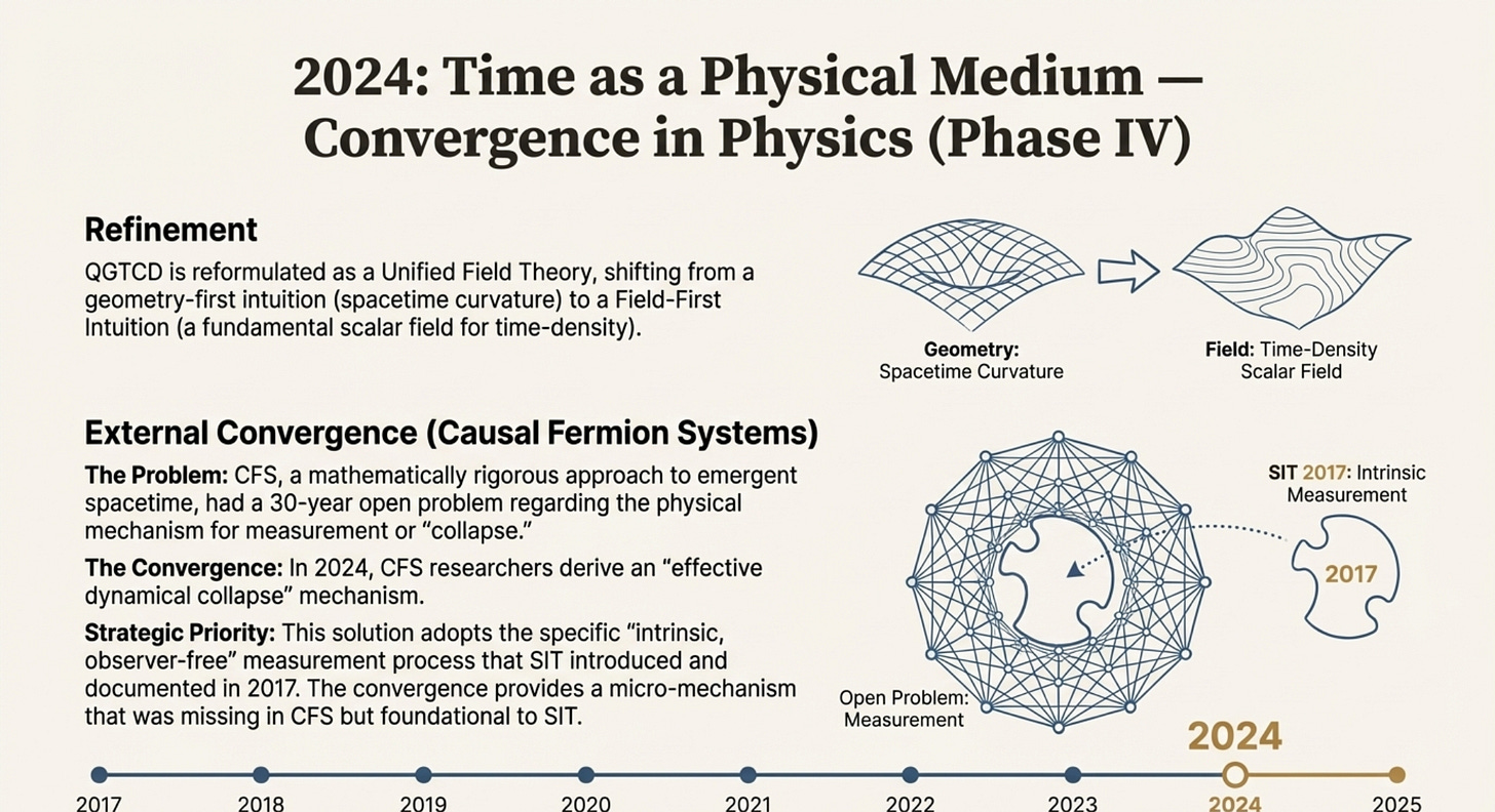 For nearly 30 years, these gaps remained open conjectures within CFS. However, following the publication and dissemination of the SIT corpus (2017–2022)—which introduced the “Coincidence Pattern” ontology and the “Distributed Observation” (NAPOT) mechanism—the CFS framework underwent a rapid transformation that mirrored these specific architectural solutions.