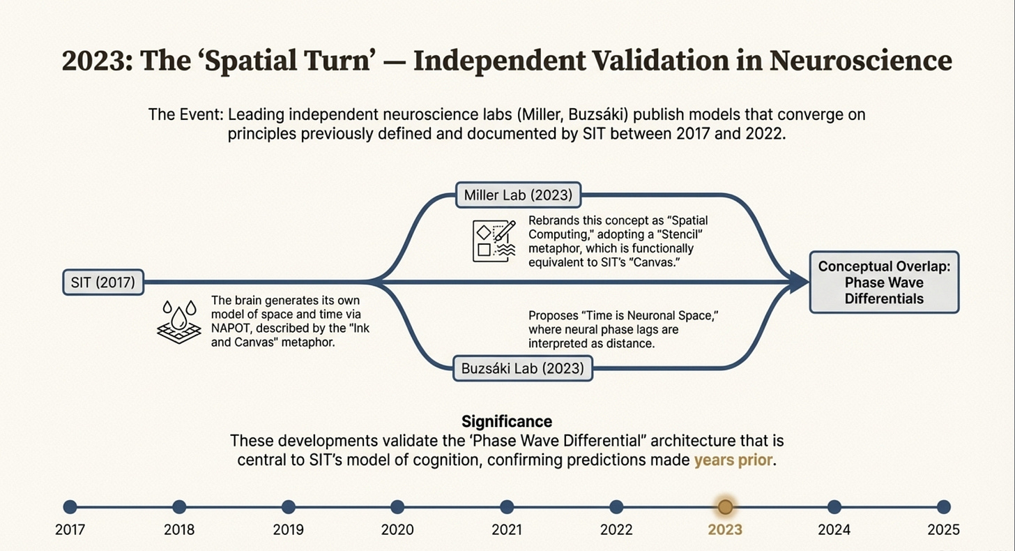 The Claim: Between 2017 and 2022, Super Information Theory (SIT) (at the time called alternative the Neural Lace Podcast (2017) and later Self Aware Networks (2022) argued that the brain does not process “time” and “space” as separate coordinates, but generates them continuously through a unified oscillatory mechanism (NAPOT/3D Screen). The Convergence: By 2023, both the Miller Lab and the Buzsáki Lab independently pivoted to this exact “Space-Time Equivalence” model, abandoning their prior modular frameworks.