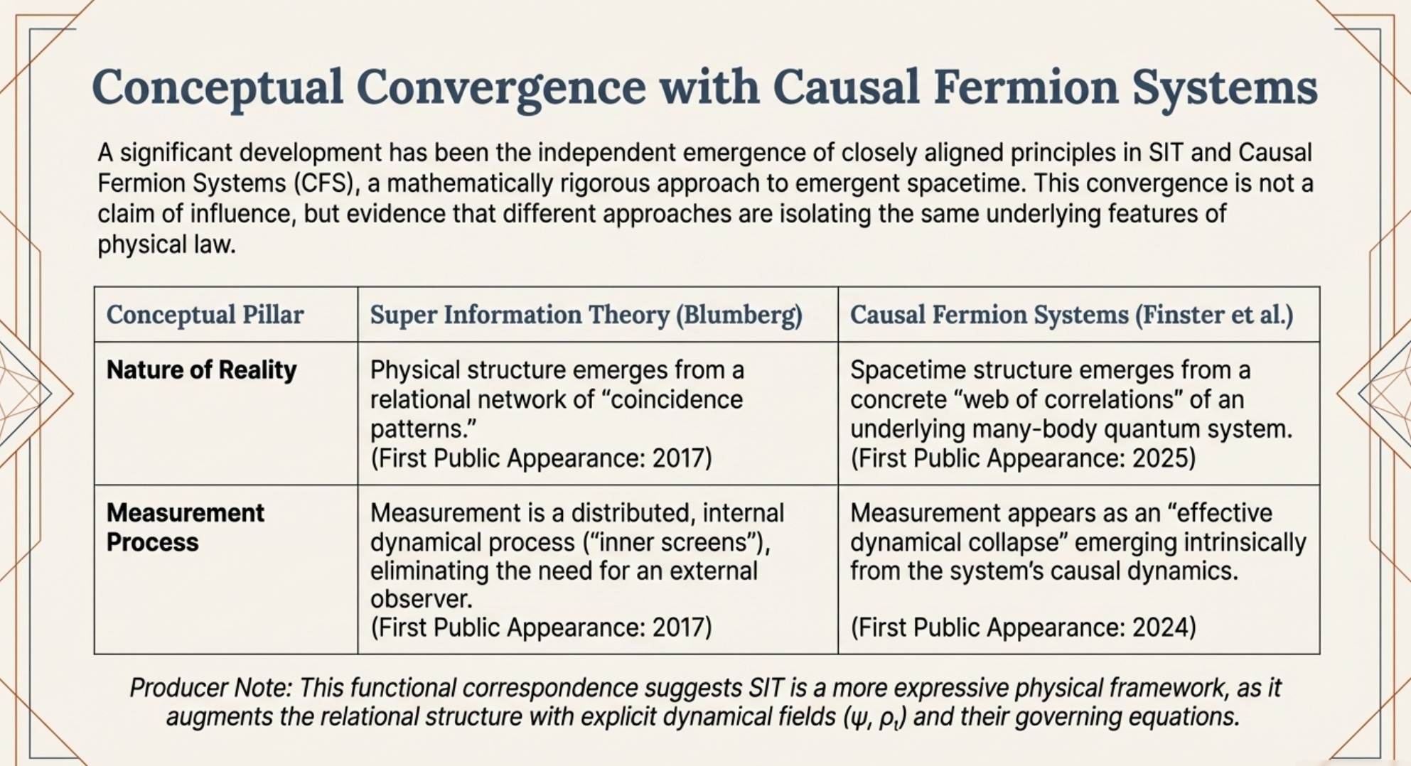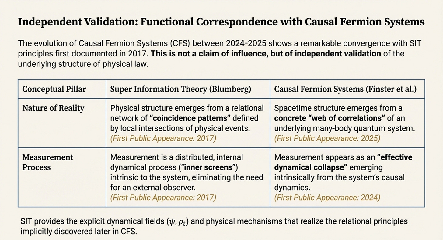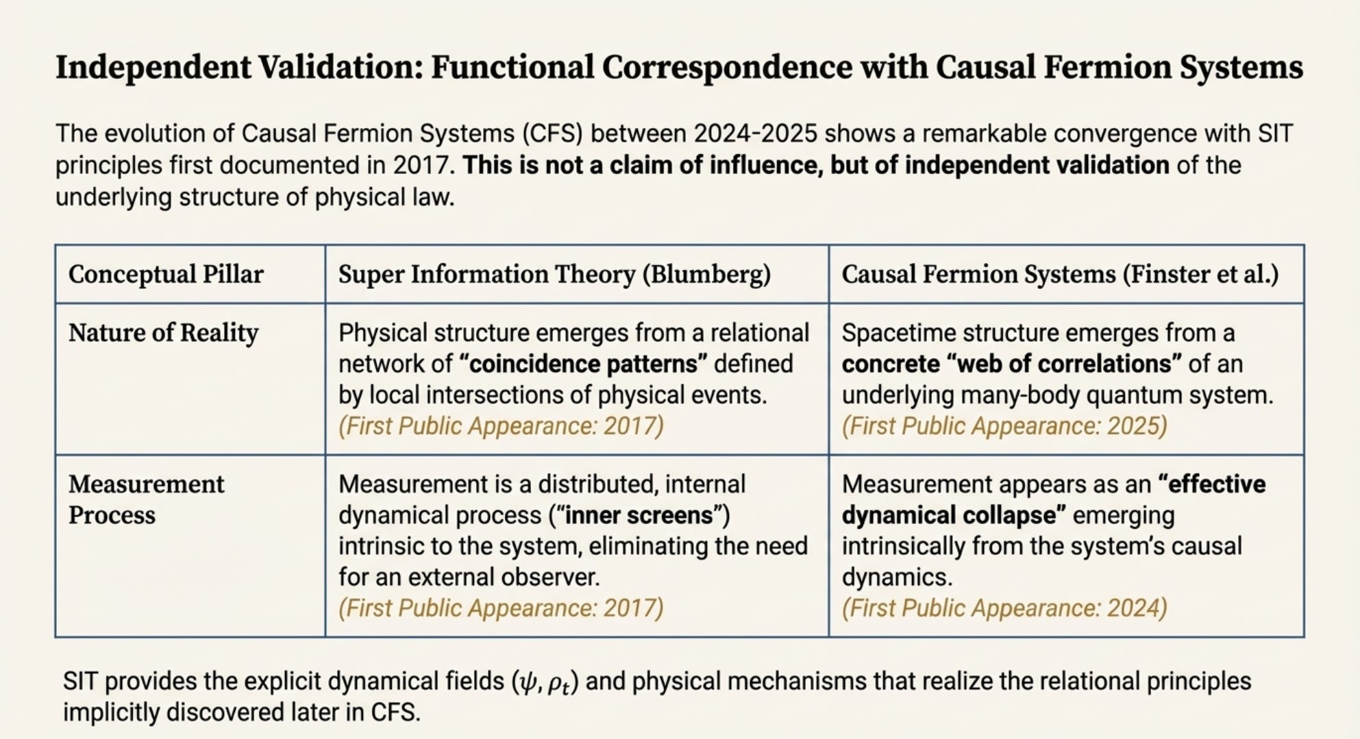 Conclusion on Priority The statistical probability of a 30-year-old theory independently evolving to solve its two oldest problems by adopting the exact conceptual and architectural constraints of a recently published rival framework (SIT) is negligible. The timeline establishes that Super Information Theory (2017–2022) holds priority over the specific physical interpretations and measurement solutions adopted by Causal Fermion Systems (2024–2025). This represents not a coincidence, but the assimilation of the SIT paradigm into the CFS framework.
