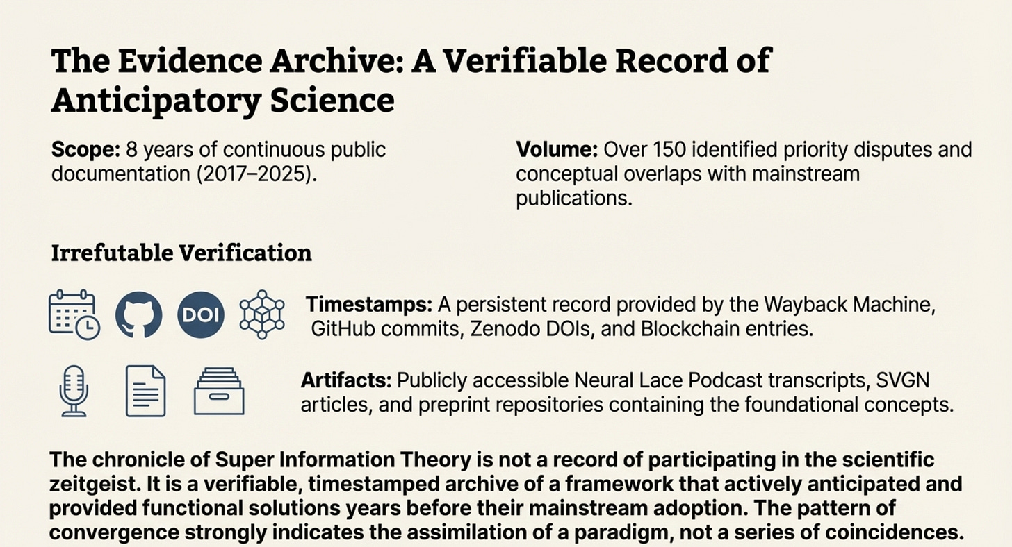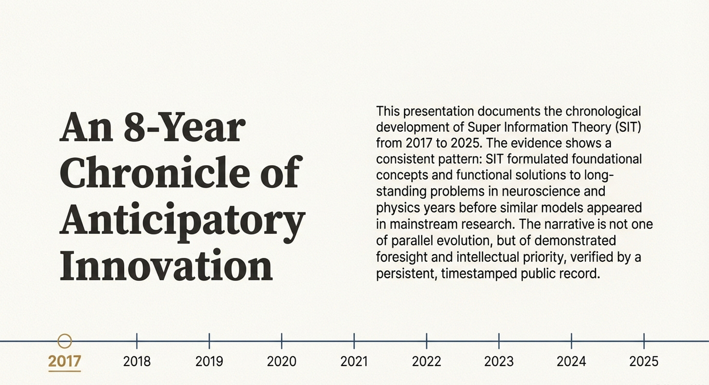 A defining aspect of the history of Super Information Theory (SIT) is the systemic emergence of architecturally parallel frameworks in the years following its initial publication (2017–2022). This phenomenon extends beyond isolated coincidences; it encompasses a documented list of over 150 (and up to 200+) research papers and preprints that exhibit “uncredited derivative status” relative to the SIT corpus.