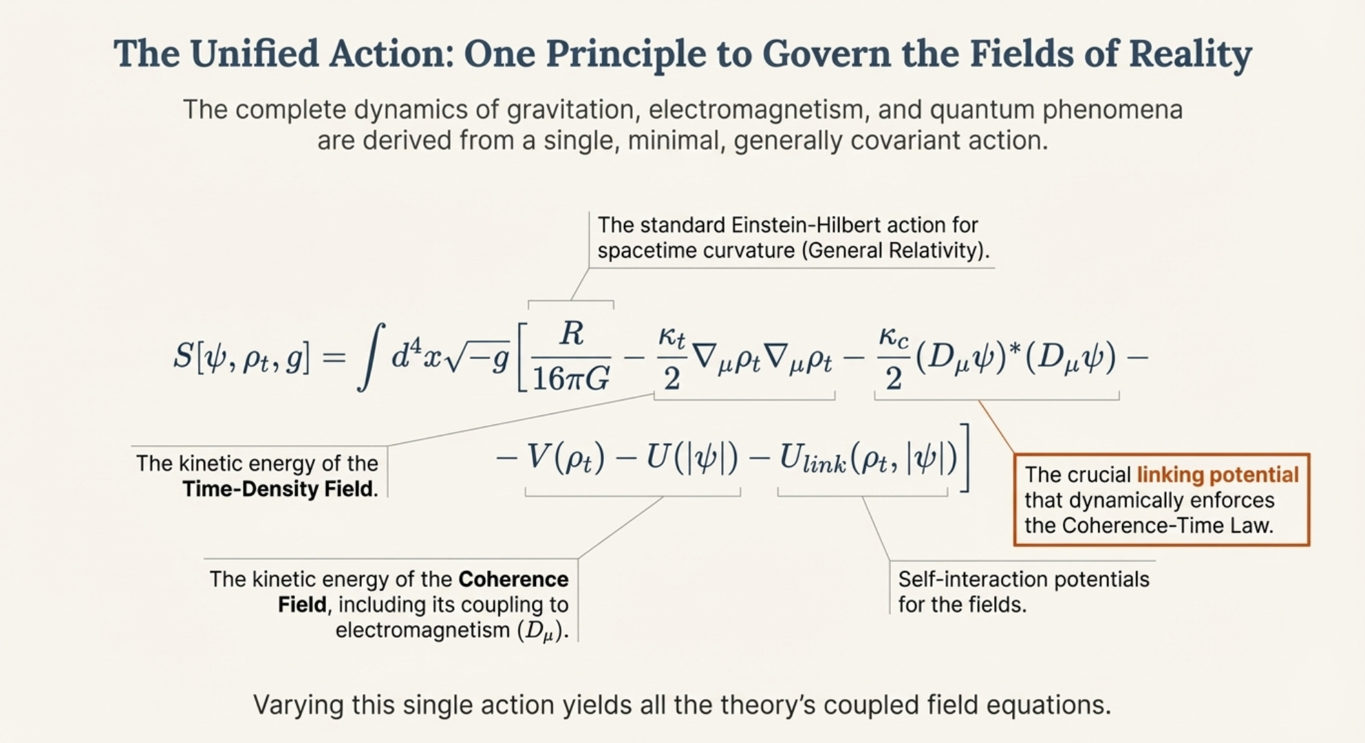 coordination to a unified field--theoretic description of coherence, time, and gravity.
