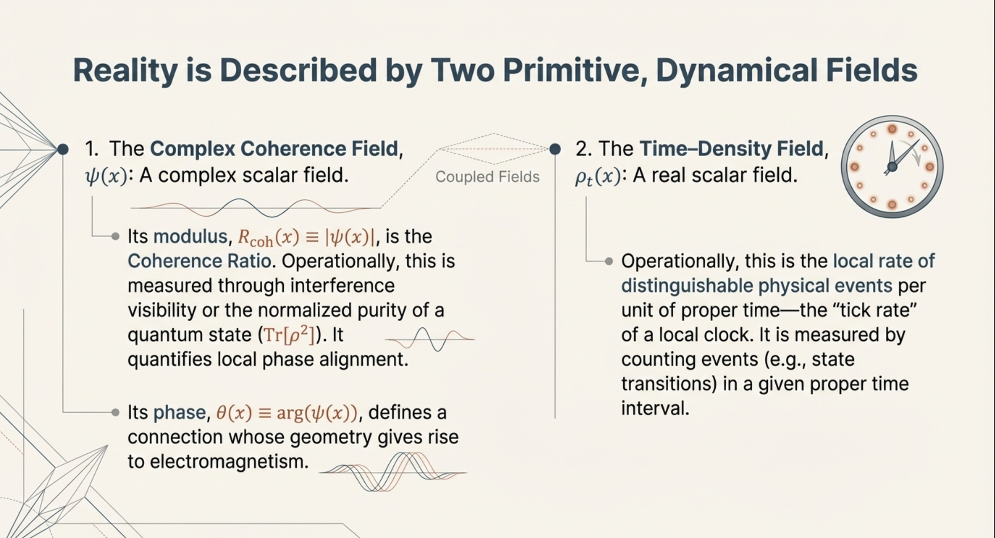 preceding developments into a single field--theoretic framework built on two primitive informational fields: a complex coherence field ψ(x) governing phase alignment and interference, and a real time--density field ρt(x) governing local clock