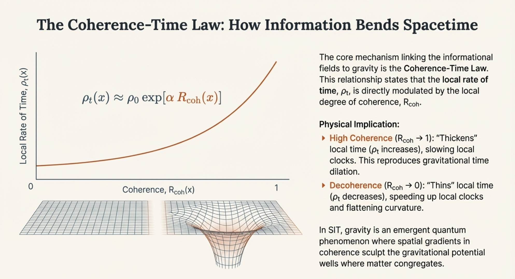 Within SIT, gravity emerges from coherence--regulated time--density gradients,