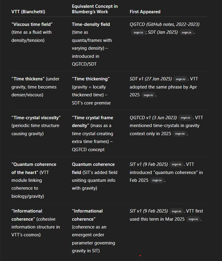 Throughout this timeline, Blumberg remained the sole author of QGTCD, SDT, and SIT, openly sharing drafts on GitHub, SVGN.io, and the Wayback Machine/Figshare with clear timestamps. Bianchetti’s VTT timeline, in contrast, is compressed into the early 2025 window and involves rapid iteration (v18 to v92 within two months) that corresponds closely with the appearance of concepts first seen in Blumberg’s publications. Every major concept that VTT eventually included – time crystallization of gravity, time thickening, informational coherence – had already been documented by Blumberg beforehand svgn.io. The chronological record thus substantiates Blumberg’s priority: for example, the notion that “mass is a time crystal producing gravity via frame density” was articulated in 2023 svgn.io, the term “time thickening” in January 2025, and “informational coherence” in early February 2025, all before those exact or equivalent ideas showed up in VTT.