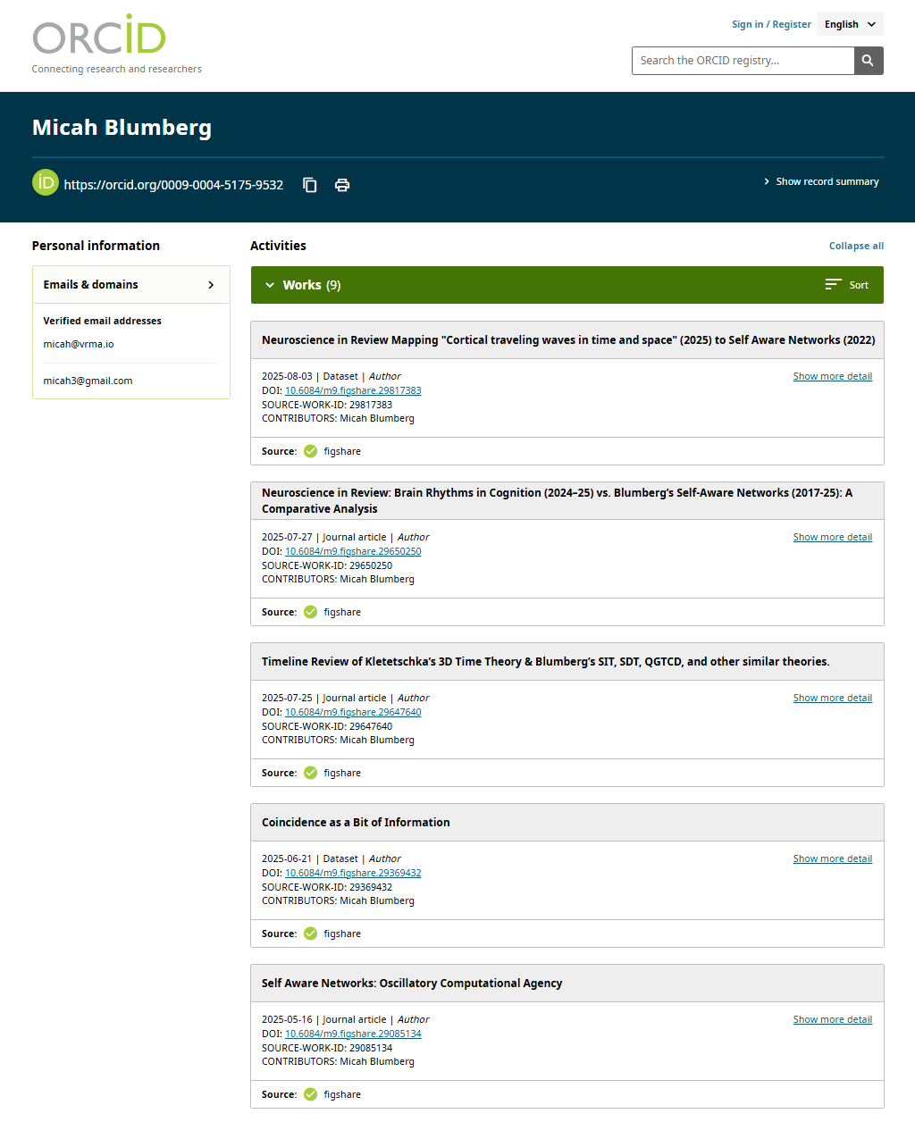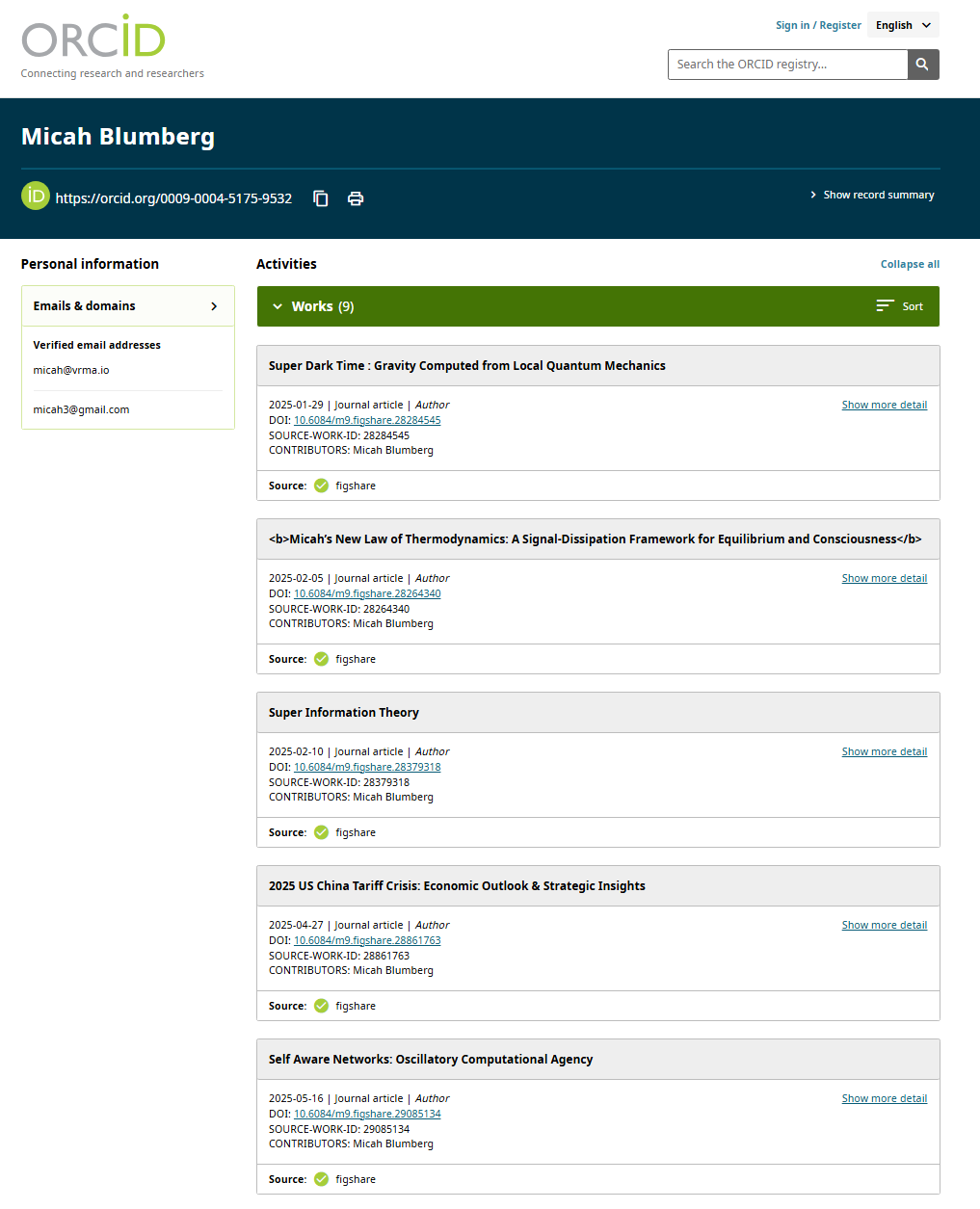 Key evidence that Super Information Theory, Super Dark Time, and Micah’s New Law of Thermodynamics were published on figshare in the period between January & March 2025 can be found on Orch ID, and on the Wayback Machine.