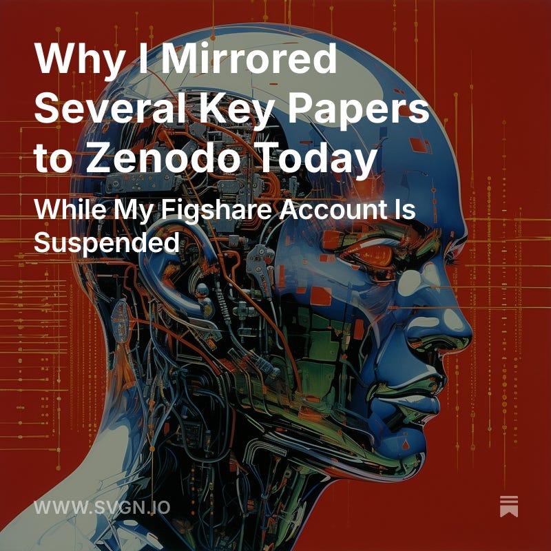 Over the last several years I’ve published a body of work (2017–2025) that has since shown up—often with different terminology—in later papers by other groups. I have publicly documented these conceptual equivalences and timelines (see SVGN.io). Given the scale and profile of these disputes, it is reasonable to suspect that complaints may have triggered the suspension. Whether or not that’s the proximate cause, the effect is the same: key scholarly records were made temporarily unreachable.
