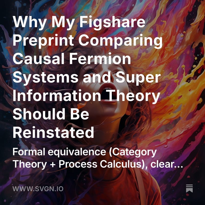 TL;DR: The latest update to my SIT manuscript added a careful, fully cited comparison with Causal Fermion Systems (CFS). It’s standard scholarly work: neutral framing, explicit disclaimers, a translation table, and formal proof-sketches (category theory + process calculus) restricted to an observational fragment with falsifiability conditions. The PDF also carries an explicit CC BY-SA 4.0 license. Nothing in the file violates Figshare’s Terms & Conditions—and the record should be restored.